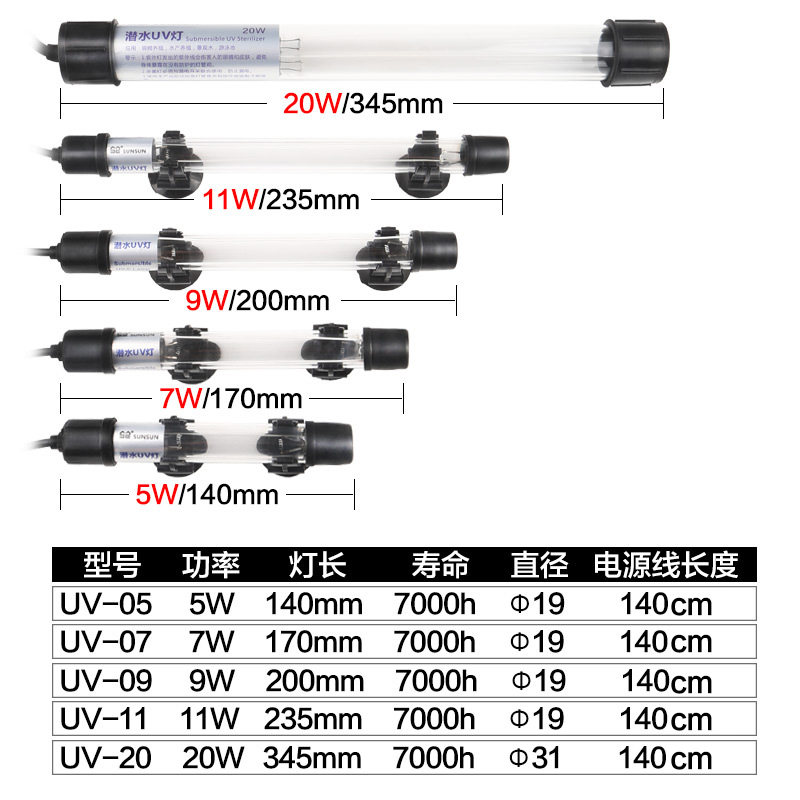 5W explosion-proof quartz sterilization lamp 14cm (0.2-0.6m fish tank) send bacteriostatic salt 7W explosion-proof quartz sterilization lamp 17cm (0.8-0.9m fish tank) send bacteriostatic salt 9W explosion-proof quartz sterilization lamp 20cm (0.9-1.2m fish tank) send bacteriostatic salt 11W explosion-proof quartz sterilization lamp 23.5CM (1.2-1.5m fish tank) send bacteriostatic salt 20W explosion-proof quartz sterilization lamp 34.5CM (1.5 or more fish tank) send antibacterial salt 40W explosion-proof quartz sterilization lamp 52.5cm (more than 2 meters fish tank or fish pond) send bacteriostatic salt (send timer) 5W explosion-proof quartz sterilization lamp 14cm send bacteriostatic salt (send timer) 7W explosion-proof quartz sterilization lamp 17cm send bacteriostatic salt (send timer) 9W explosion-proof quartz sterilization lamp 20CM send bacteriostatic salt (send timer) 20W explosion-proof quartz germicidal lamp 34.5CM send bacteriostatic salt (send timer) 40W explosion-proof quartz germicidal lamp 52.5CM send bacteriostatic salt (bring your own 2). 4 hours simple timer) 5W explosion-proof quartz sterilization lamp Send bacteriostatic salt (with 2 4 hours simple timer) 7W explosion-proof quartz sterilization lamp Send bacteriostatic salt (with 2 4 hours simple timer) 9W explosion-proof quartz sterilization lamp Send bacteriostatic salt (with 2 4 hours simple timer) 11W explosion-proof quartz sterilization lamp Send bacteriostatic salt With light barrier 6W upgrade 23CM + bacteriostatic salt with light barrier 8W upgrade 23CM + bacteriostatic salt with light barrier 10W upgrade 28CM + bacteriostatic salt 12W upgrade with light barrier 28CM + bacteriostatic salt With light barrier 14W upgrade 28CM + bacteriostatic salt 3W upgraded 8.5CM + bacteriostatic salt (suitable for small fish tank filter tank)