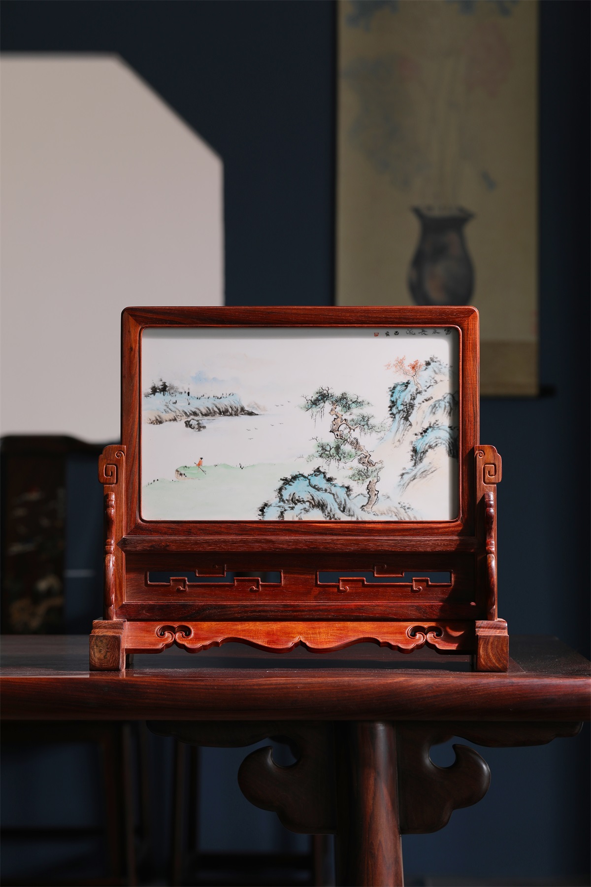 Big red rosewood inlaid pastel porcelain plate painting illustration screen