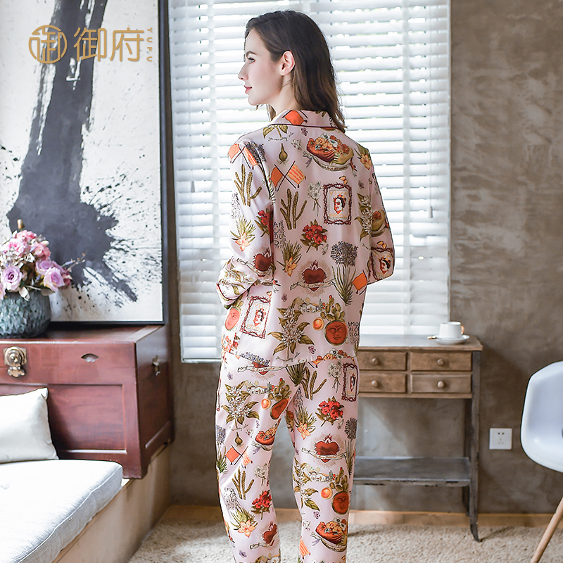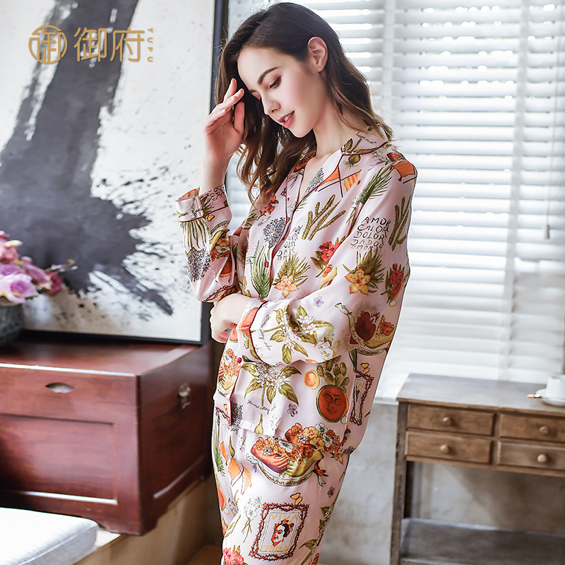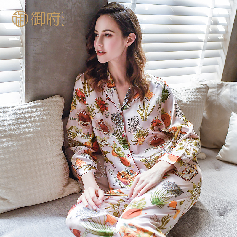 Mifu printed long sleeves weighing 100% mulberry silk pyjamas women's two suit brands Spring and Autumn true silk home clothes-Taobao