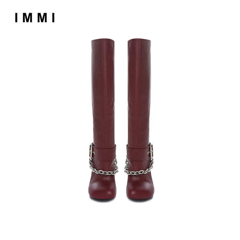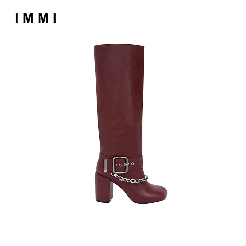 (designer brand IMMI) pure color square head chain decorated cow leather wide cylinder display slim long boot 192SH004L