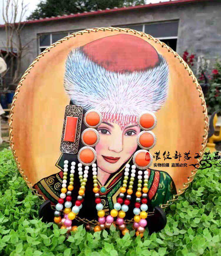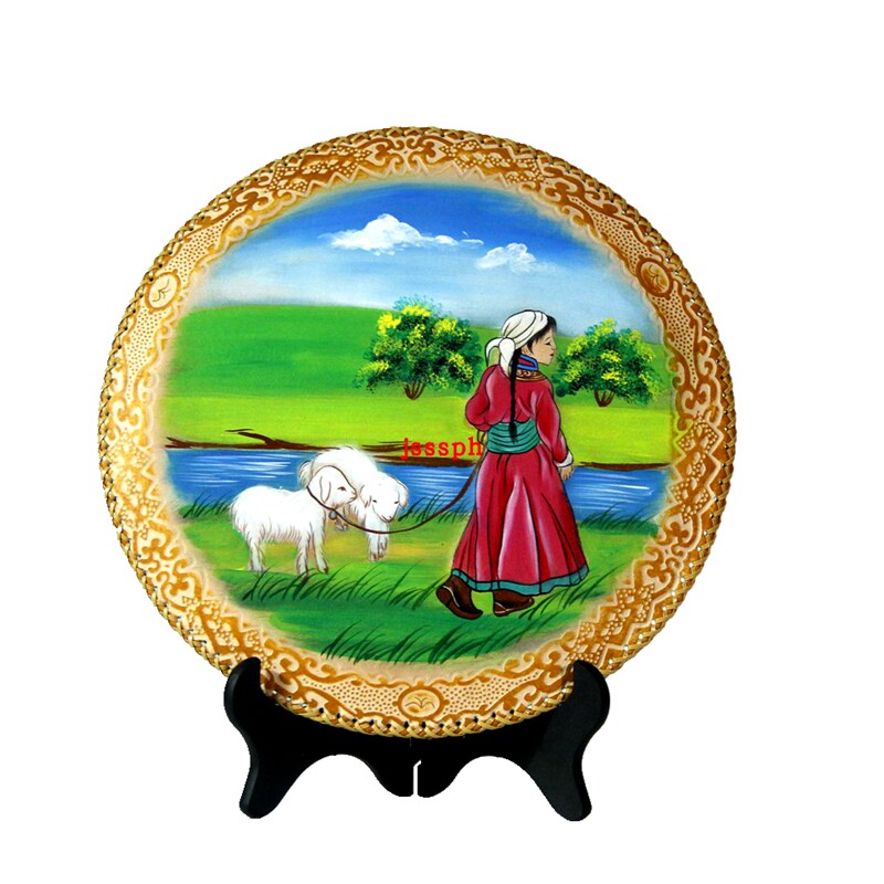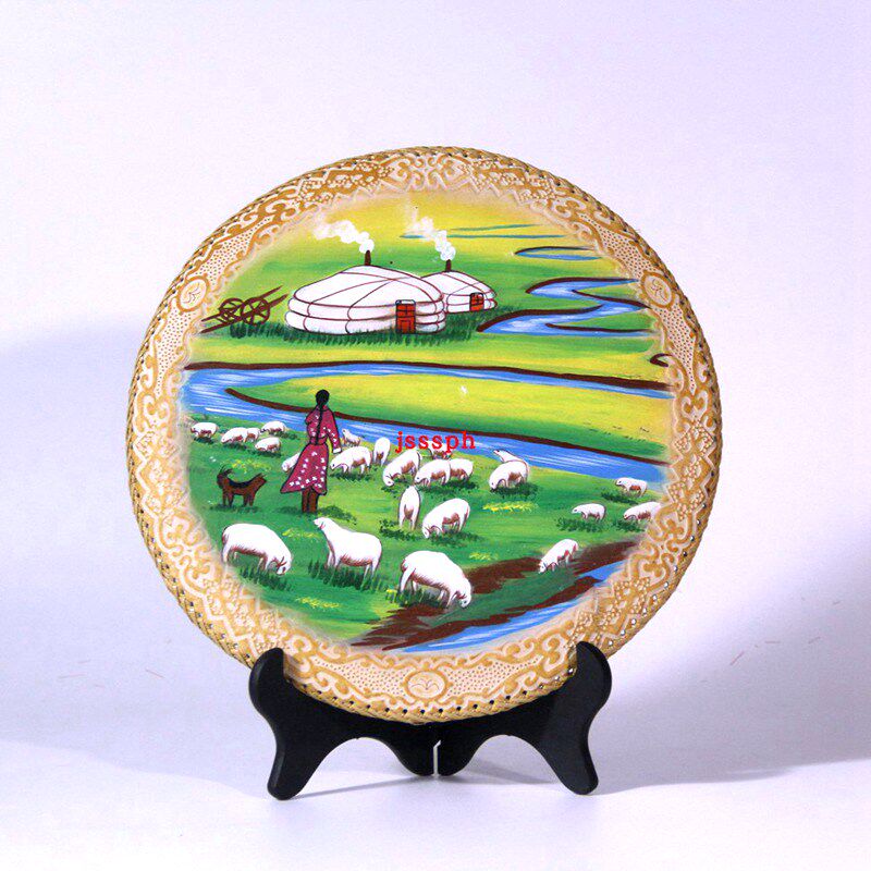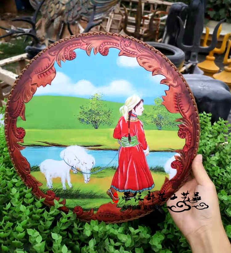 Mongolian Craft Gift Pendulum leather painting Mongolian specialities Decorative Disc Pendulum Table Painting Living-room Pendulum with Hand-painted Real Cow Leather