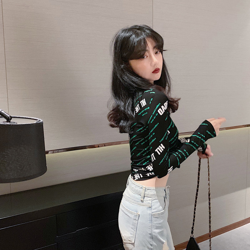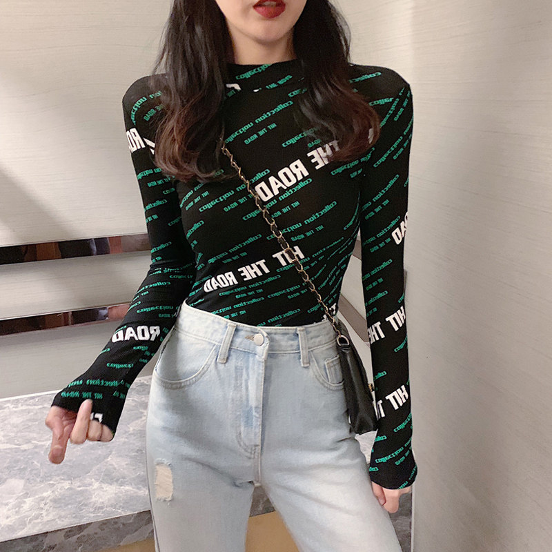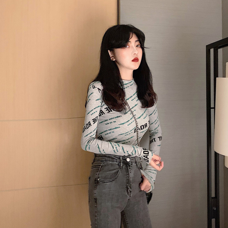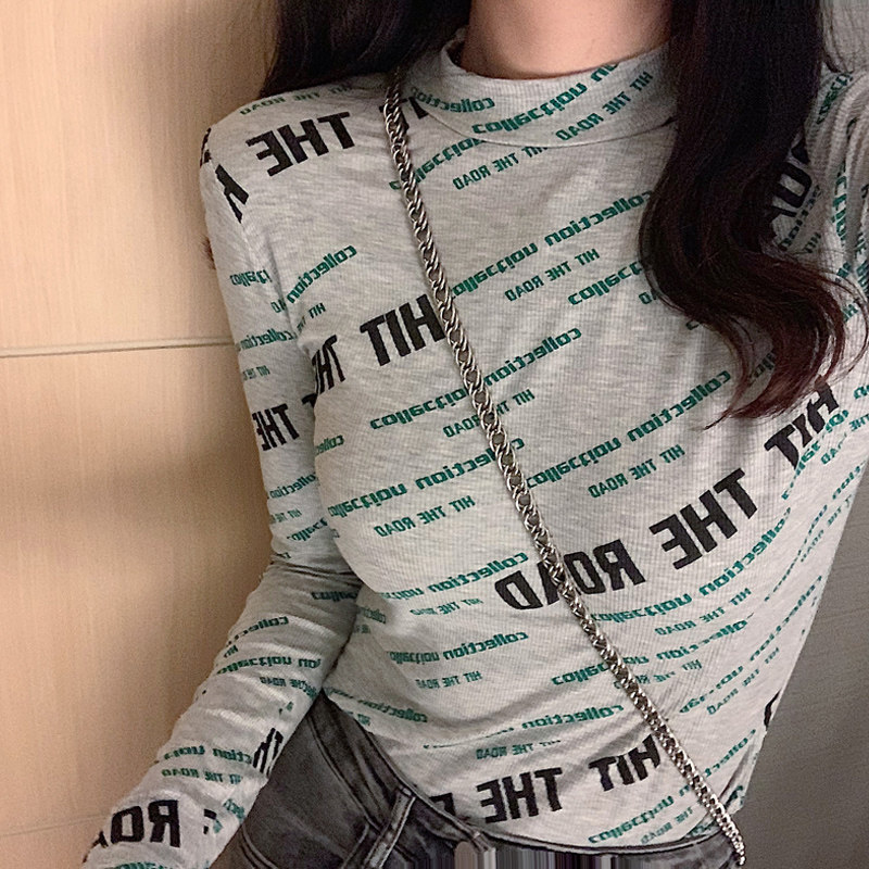 Gray stand-up collar base shirt women's autumn and winter 2021 new printing slim slim letters long-sleeved t-shirt top