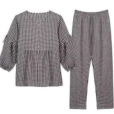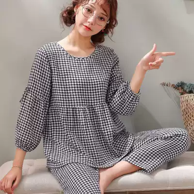 Pajamas women Spring and Autumn Winter cotton long sleeve suit cardigan Korean version of simple students cotton woven plaid home clothing