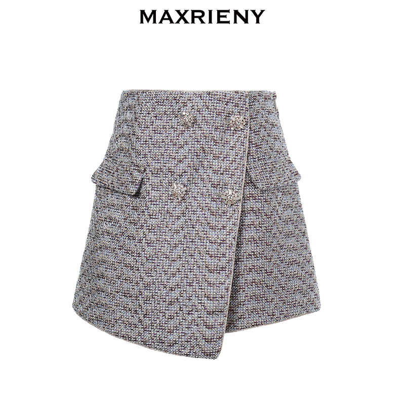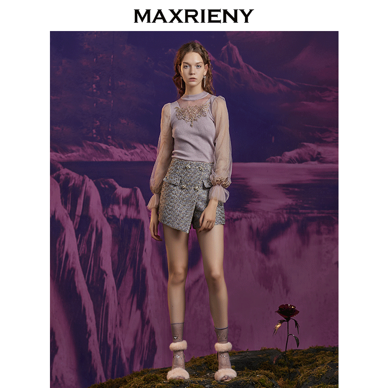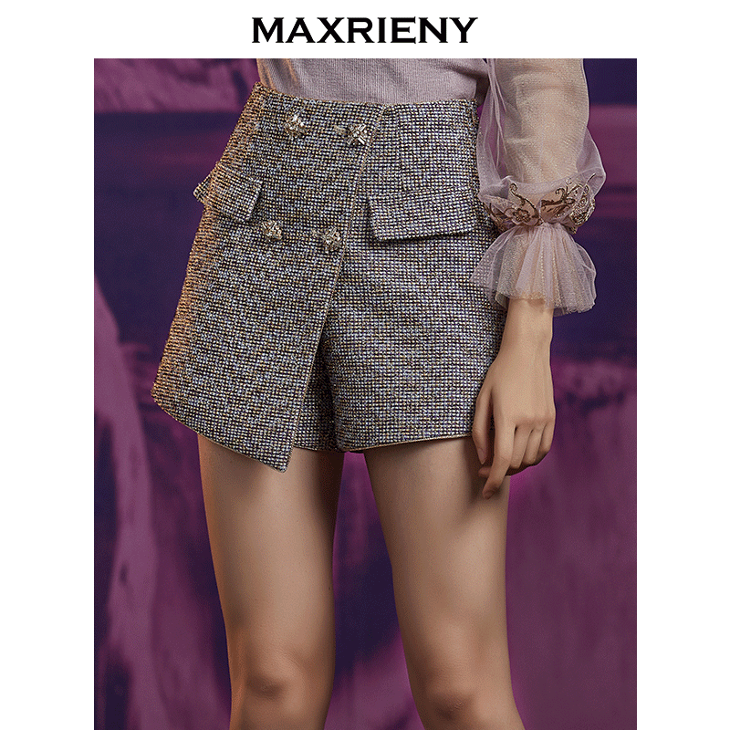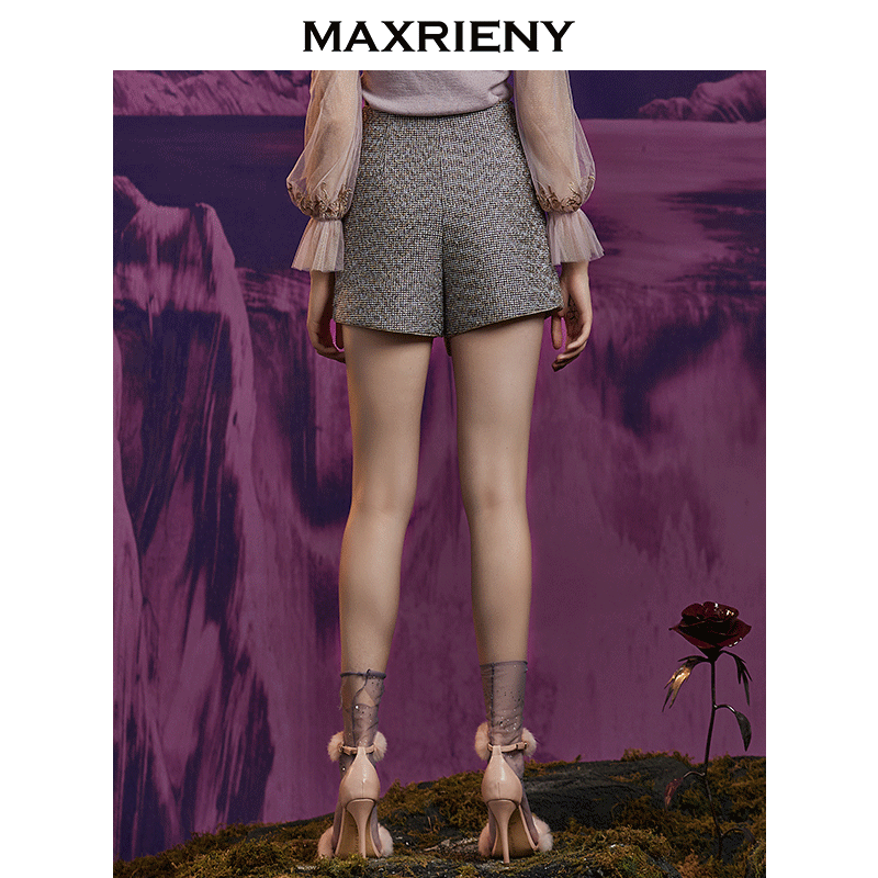MAXRIENY winter season new retro flower yarn high waist shorts asymmetrical straight pants female slim all-match