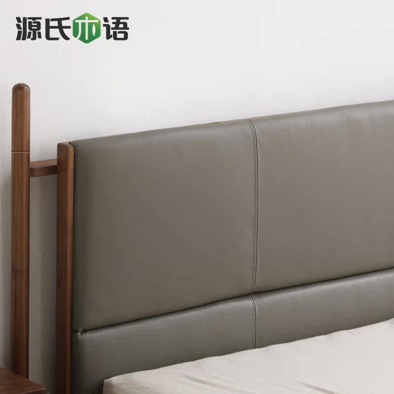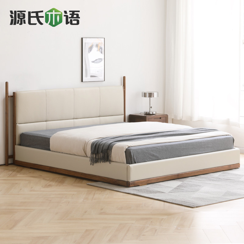 Genji wood language Pure solid wood bed Modern simple black walnut wood layer cowhide soft bag bed Nordic Master bedroom Double bed