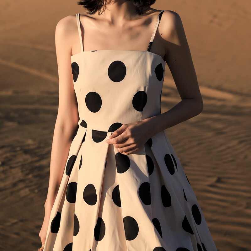 French vintage skirt high waist and thin waist slim wavepoint sling sling in long dress with small dress sleeveless