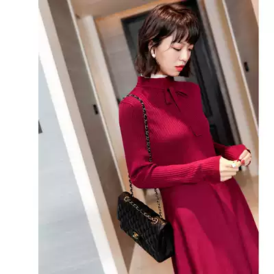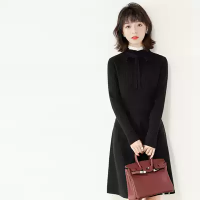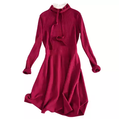 Visible fashion age reduction strength is slim ~ Contrast lace collar knitted dress medium and long version of autumn and winter