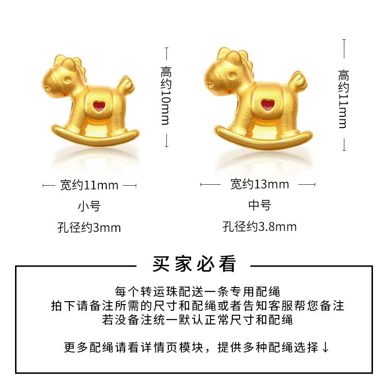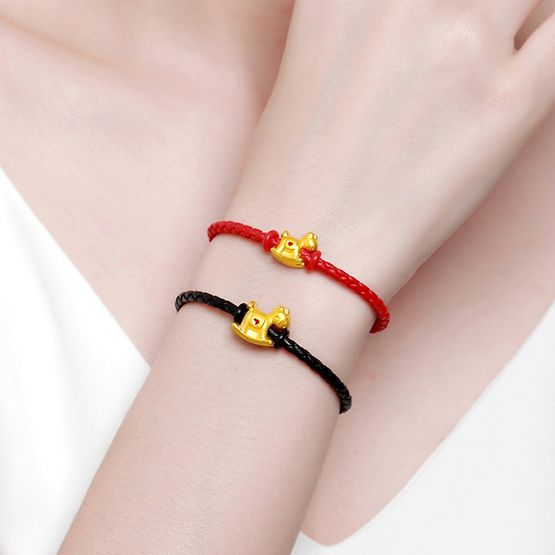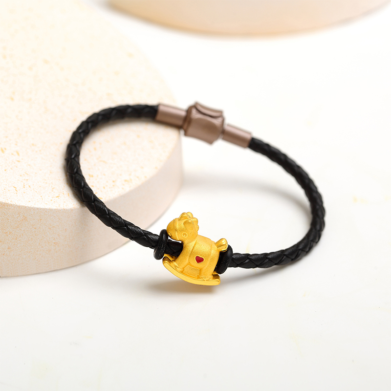 Small Trojan horse gold hand chisel female 999 pure gold 3D hard gold zodiac horse pure gold transfer bead leather rope bracelet boy baby