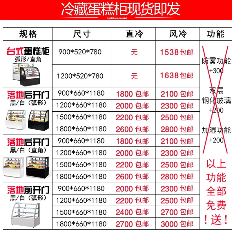 Cake Cabinet Factory Direct Sales Freezing Point Price (Upgrade) 1.2m Desktop Normal Temperature (Upgrade) 0.9m After Landing Door Normal Temperature (Upgrade) 1.2m After Landing Door Normal Temperature (Upgrade) 1.5m After Landing Opening Normal Temperature (Upgrade) 0.9m After Landing Open Door Direct Cooling (Upgrade Model) 1.2m After Landing Door Direct Cooling (Upgrade Model) 1.5m After Landing Door Direct Cooling (Upgrade) 1..8m Landing After Landing Door Direct Cooling (Upgrade) 1.5m Open Door Straight Cooling (Upgrade Model) 1.5m Open Door Straight Cooling Before Landing (Upgrade Model) 1.8m Open door direct cooling before landing (upgraded version) 0.9m desktop air cooling (with defog humidification) (upgraded version) 1.2m desktop air cooling (with defog humidification) (upgrade) 0.9m after landing door air cooling (with defog humidification) (upgrade) 1.2m after landing door air cooling (with defog humidification) (upgrade) 1.5m after landing to open the door air cooling (with defogging and humidification) (upgrade) 1.8m open the door after landing air cooling (with de-fog humidification) (upgrade) 0.9m before landing to open the door air cooling (upgrade) 1.2m before landing door air cooling (upgrade model) 1.5m landing before opening the door air cooling (upgrade model) 1.8m open door air cooling before landing