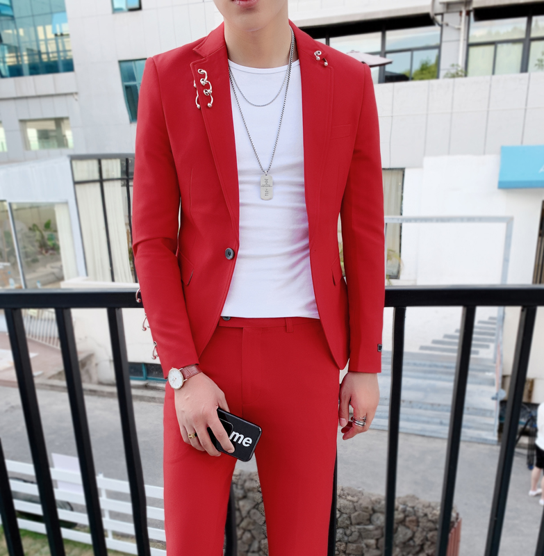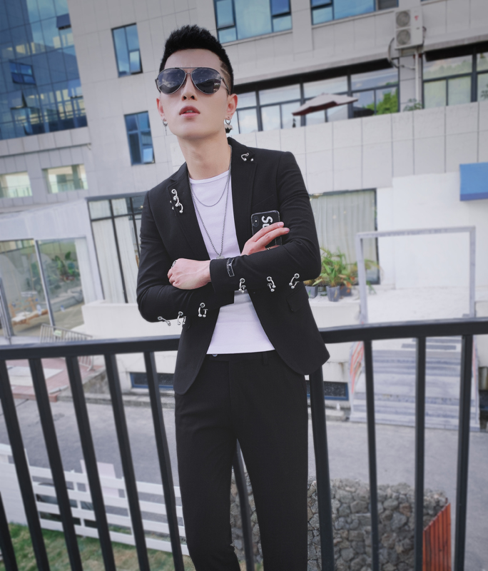 Personality tight men's style set with a small code West suit Han version handsome gas trend to fix a small suit hair stylist suit