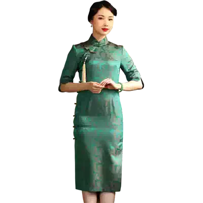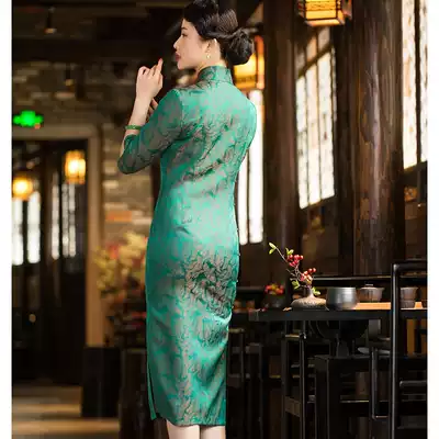Xi Yue 2021 spring and summer new retro silk jacquard high-end medium and long version side placket cheongsam dress western dress female