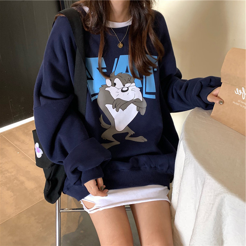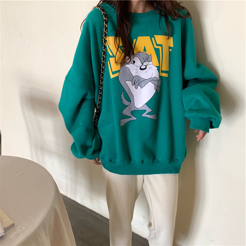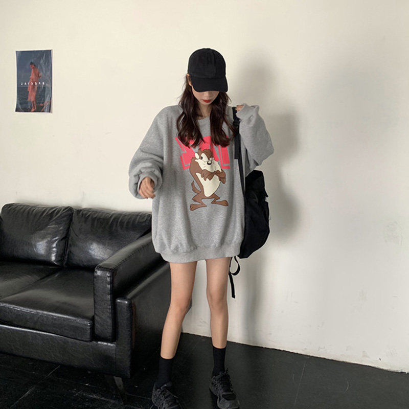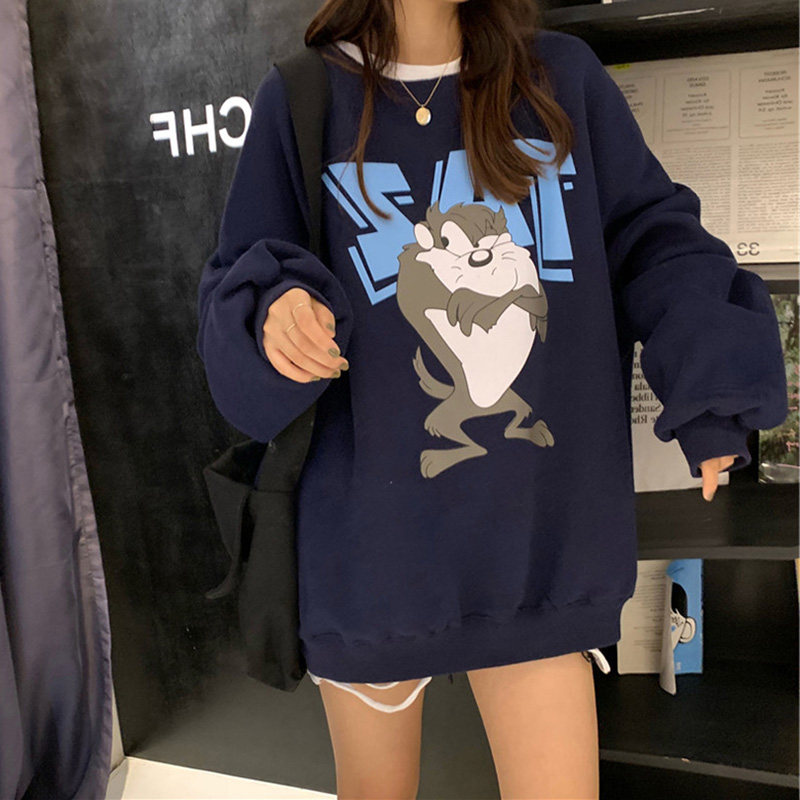 women's spring autumn thin round neck thick cotton T 2021 new cartoon student mid length non-hooded lazy korean style