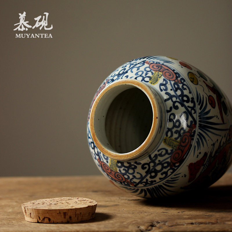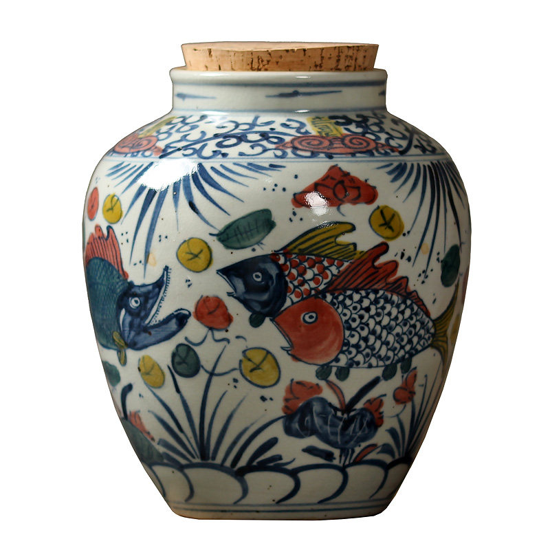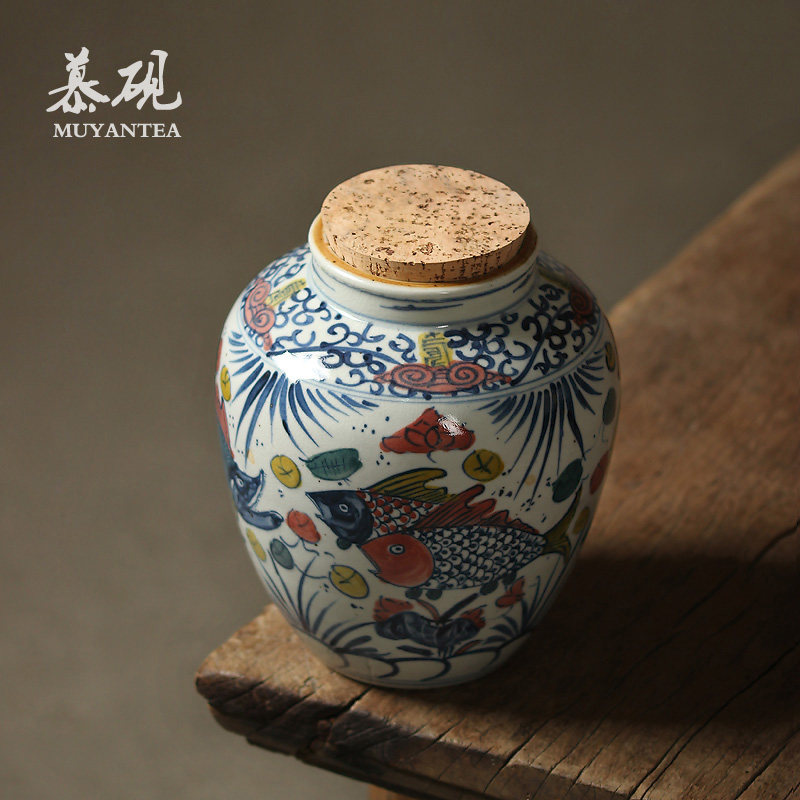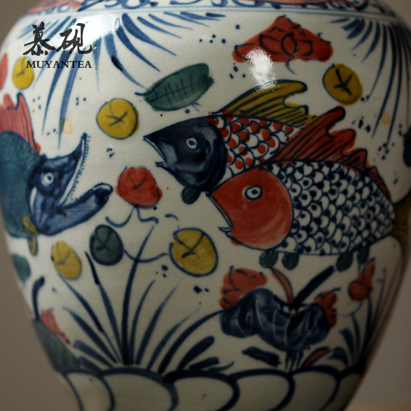 Mu Yan hand painted blue and white large tea pot fish bath pattern sealed wooden plug cover Wake up tea pot Kung Fu tea retro tea warehouse