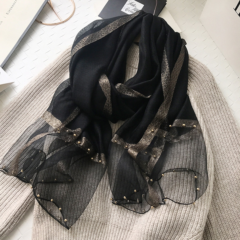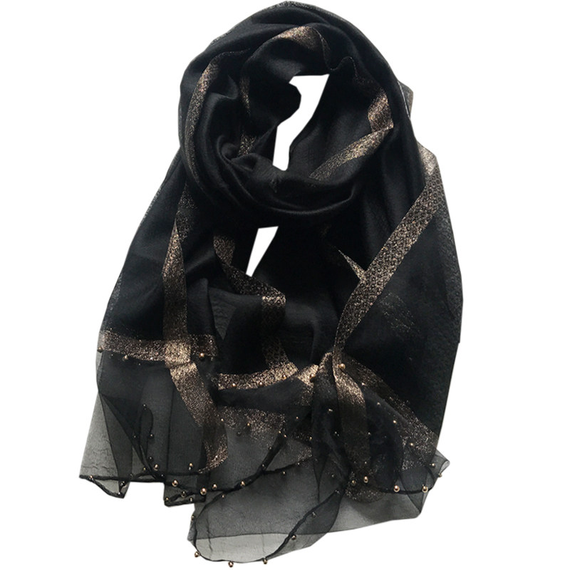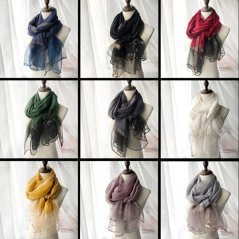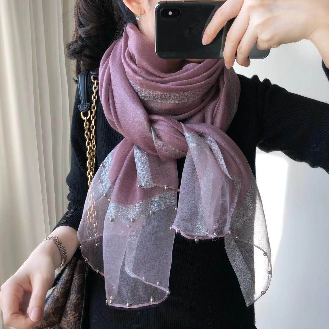 Silk scarves women 100 hitch spring autumn Korean version gold thread water corrugated pure color genuine silk nail beads scarf thin shawl long yarn towel fall