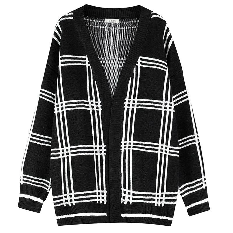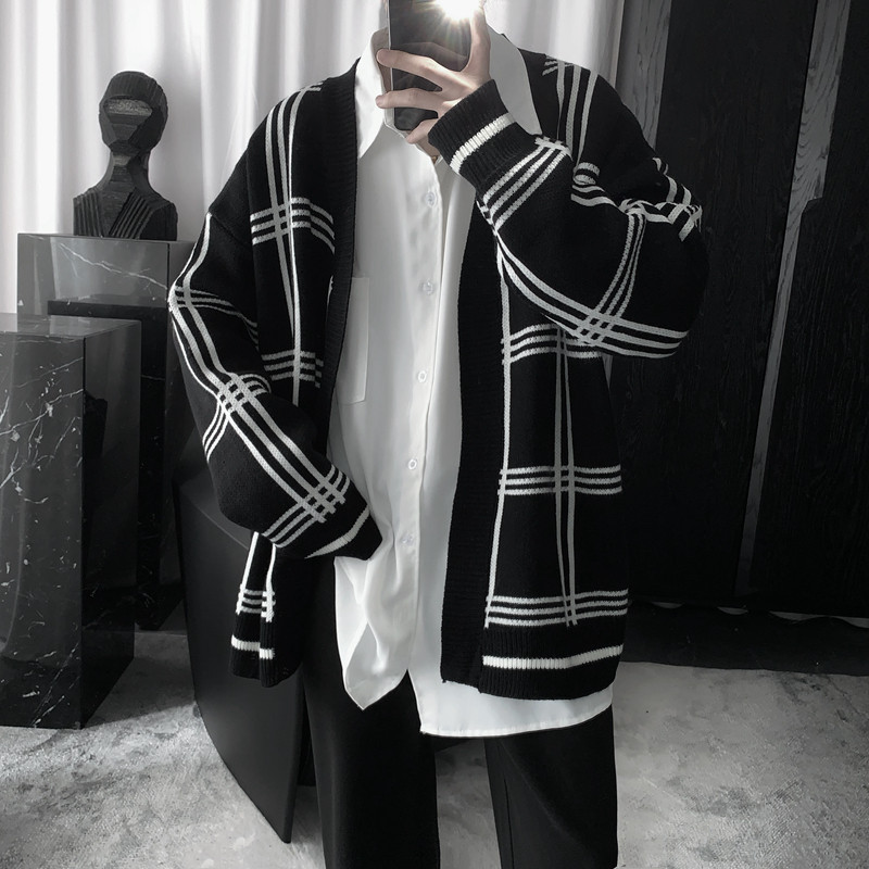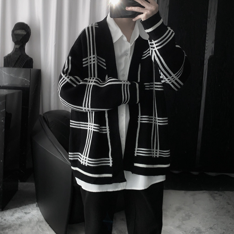 Black and white plaid knit man languid wind loose and thick sweater cardigan coat couple