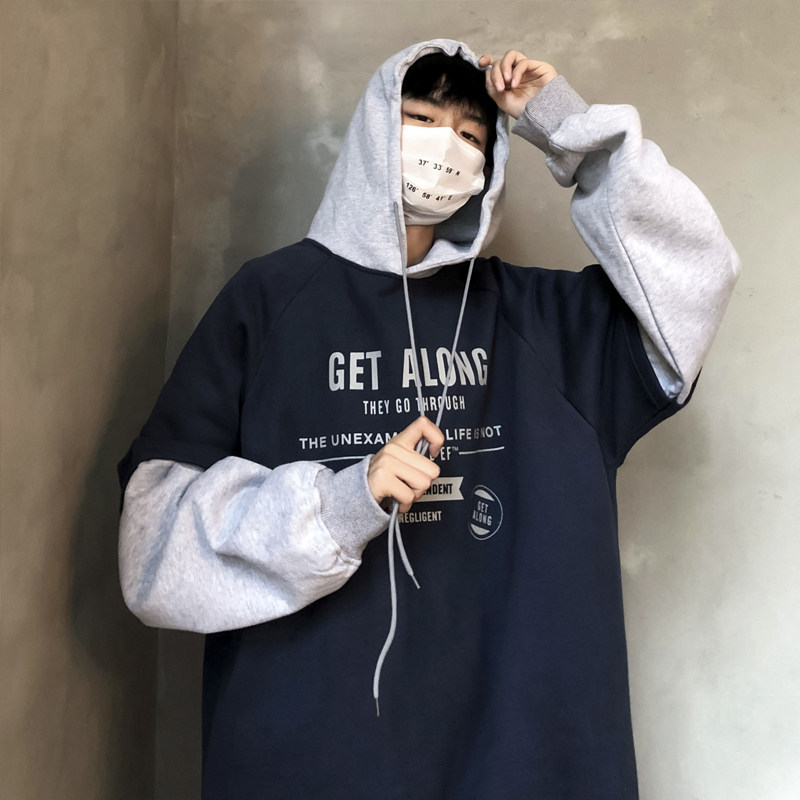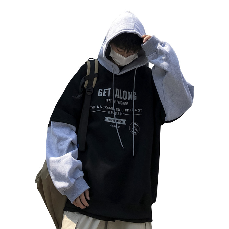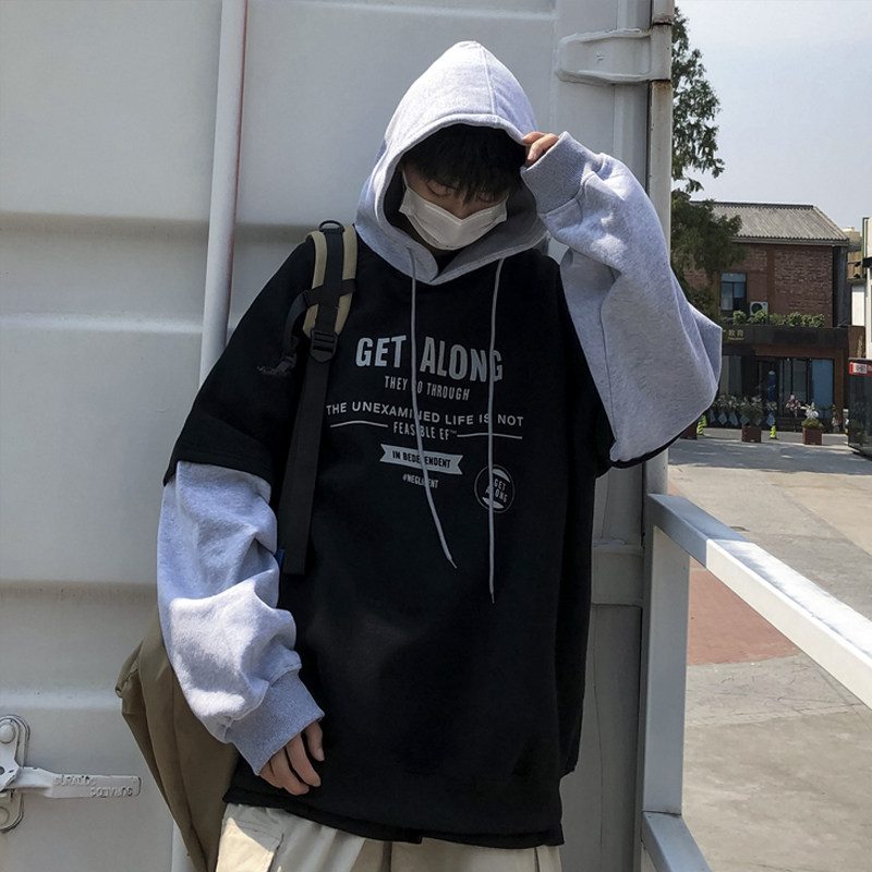Fake two hooded sweatshirts boys spring and autumn Korean version of the trend les handsome t loose ins Port wind super fire couple outfit