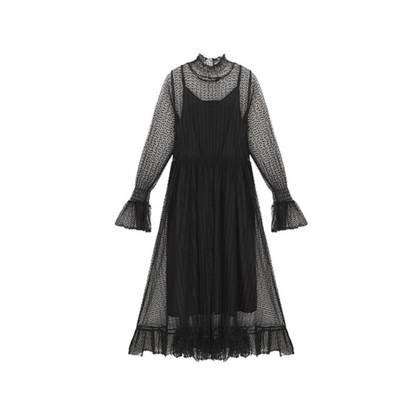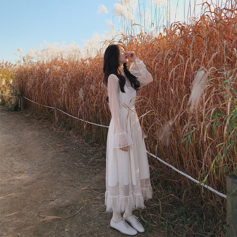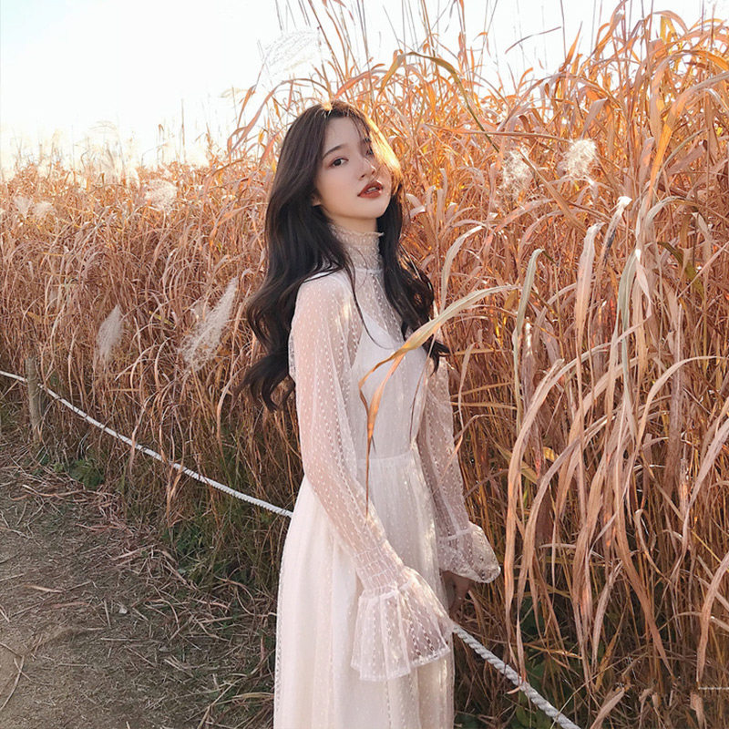 2021 spring new high cold royal sister wind mature super fairy quality lace tie dress female over-the-knee long skirt