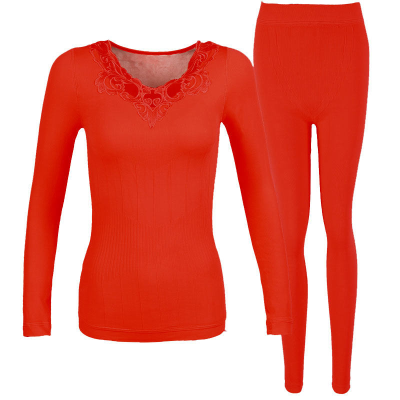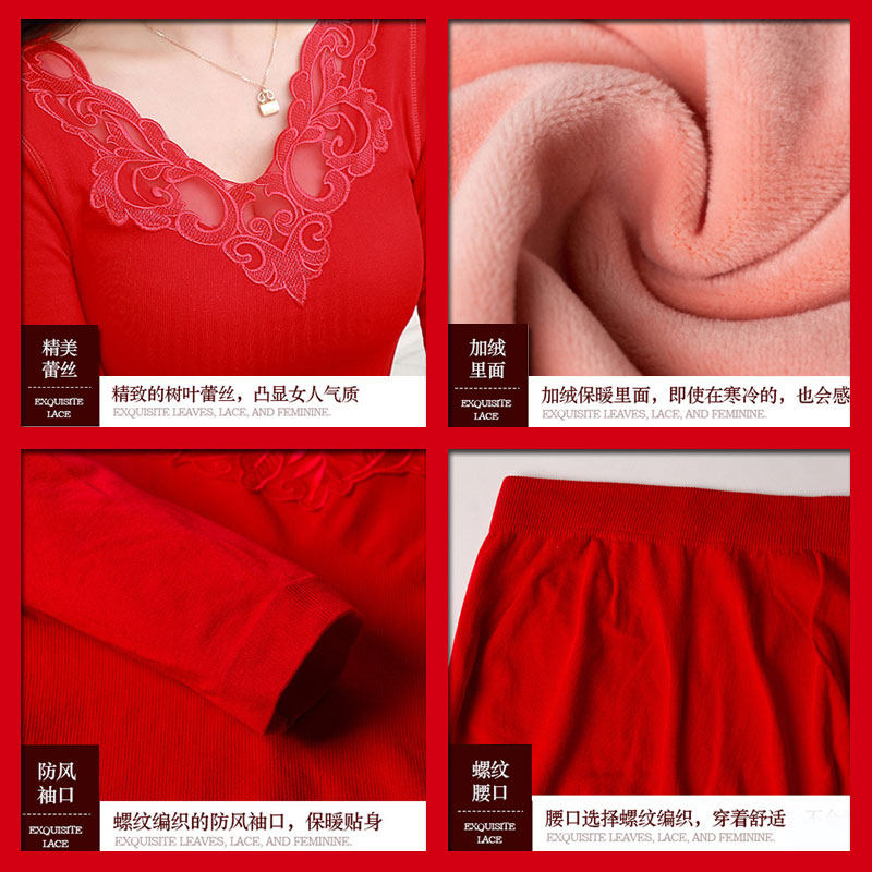 This life year plus thickening warm underwear blouse sweater sanitary pants lady married lace V-collar big red suit