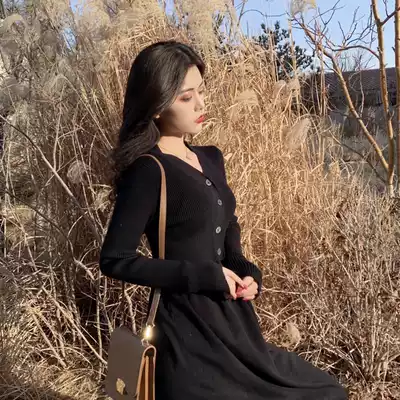 Spring and autumn new temperament waist long-sleeved knitted dress female small black skirt with long skirt mid-length sweater skirt