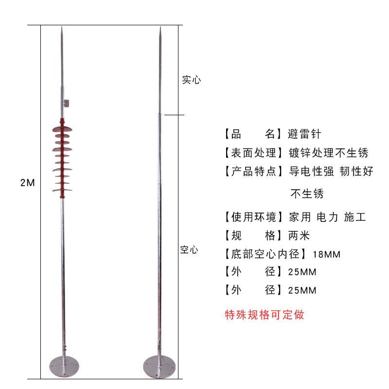 Two-meter common lightning rod (hot-dip galvanizing) two meters with insulator lightning rod (heat zinc) 2 m insulator 25 flat copper wire 5 m 1 m ground pin 2 m insulator 25 flat copper wire 10 m