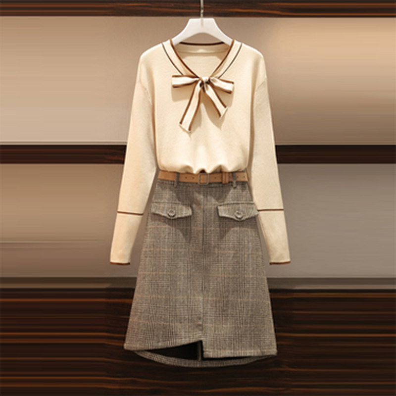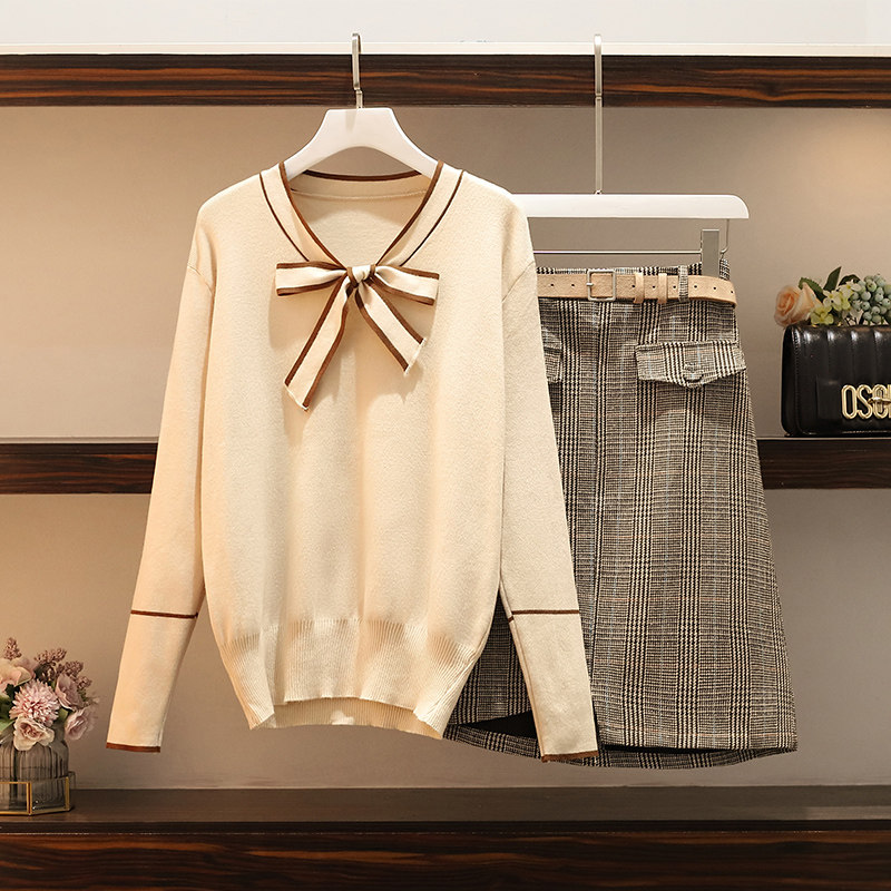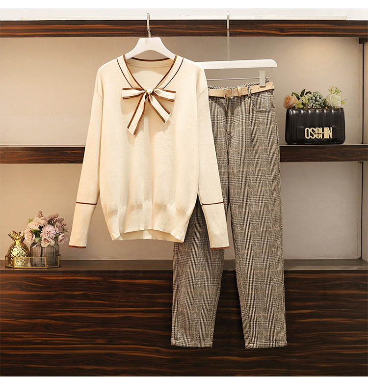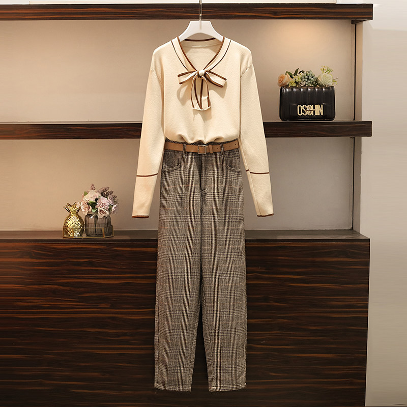 Large size women's dress 2022 Autumn loaded with new fat sister Conspicued Slimmer Minus-Age Foreign Pie Sweater Net Red Long Pants Two-piece Suit Dress