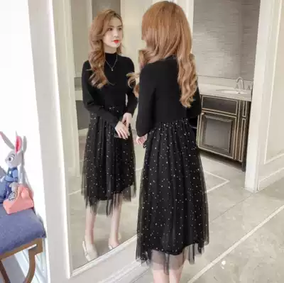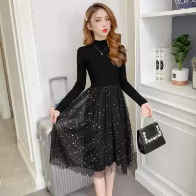 Base skirt female autumn 2021 New Korean fashion mesh stitching semi-high collar slim long sleeve knitted dress