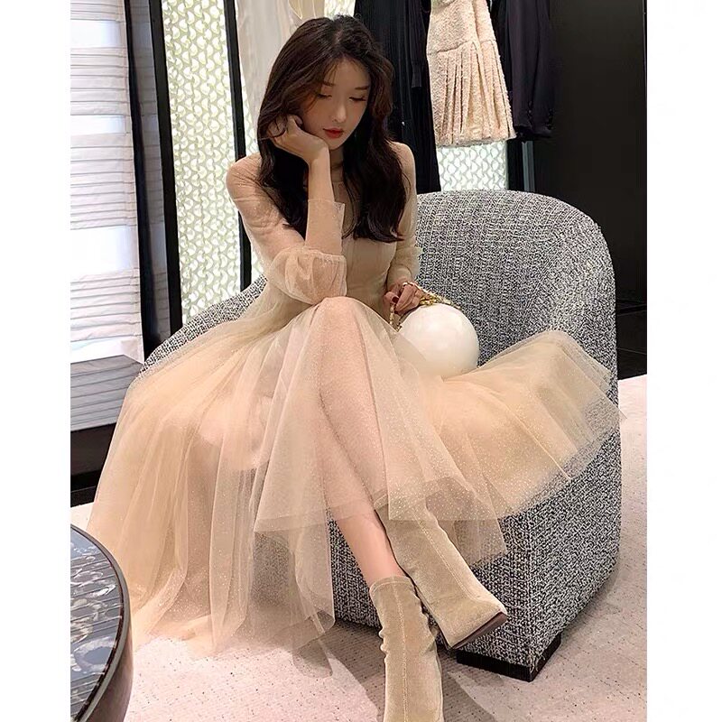 Fan-style foreign dress collection waist display slim gown 2021 early spring fairy yarn dresses long version of super-fairy gentle wind two-piece set