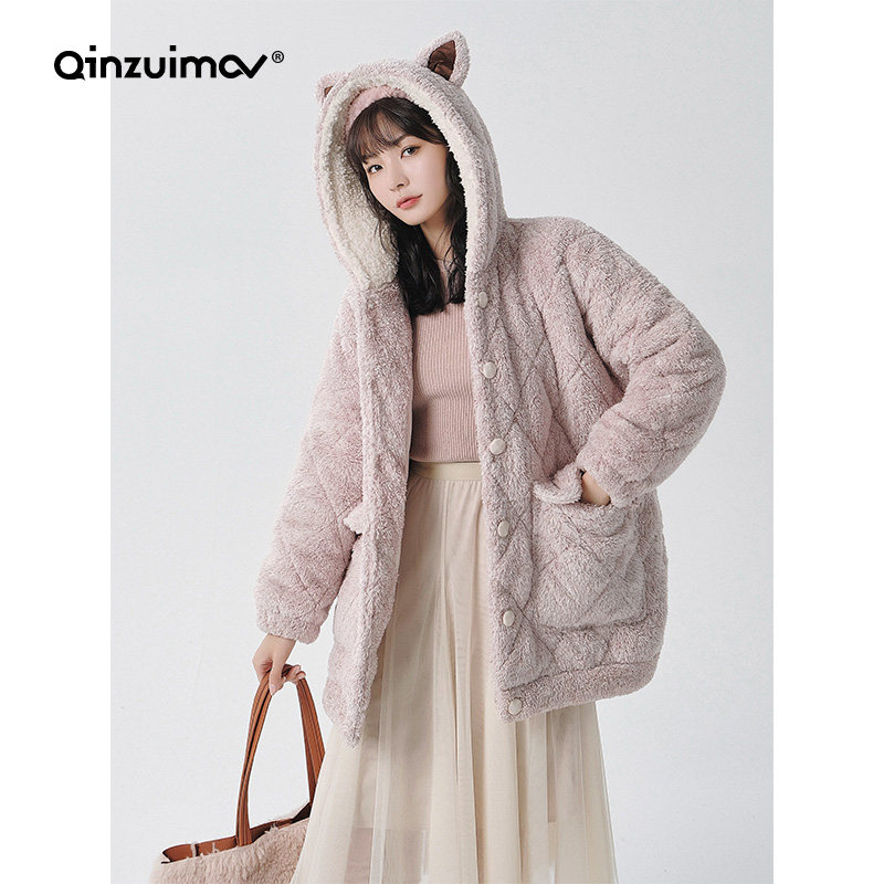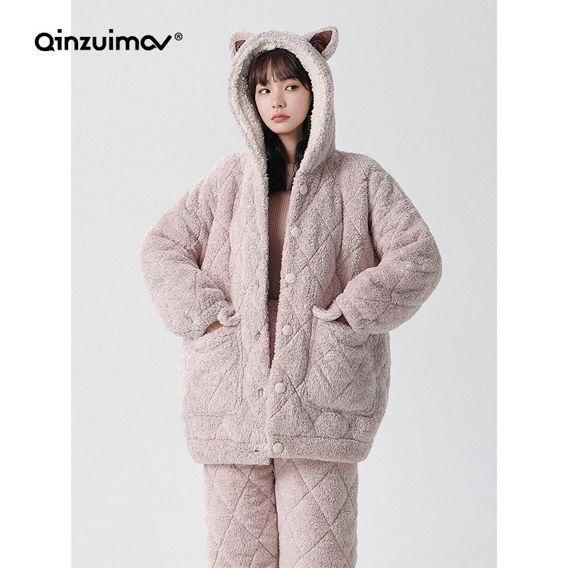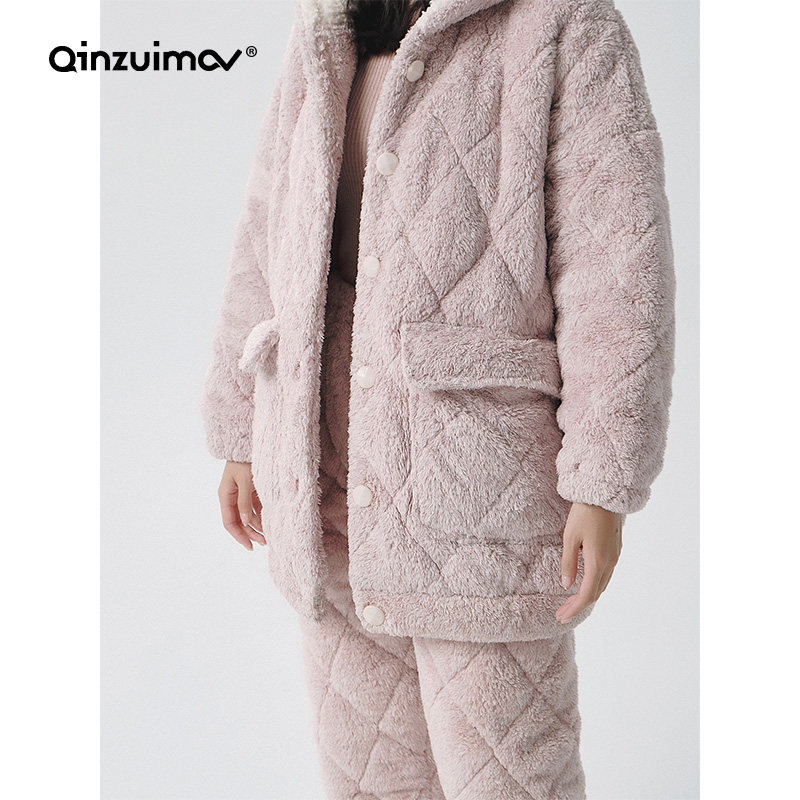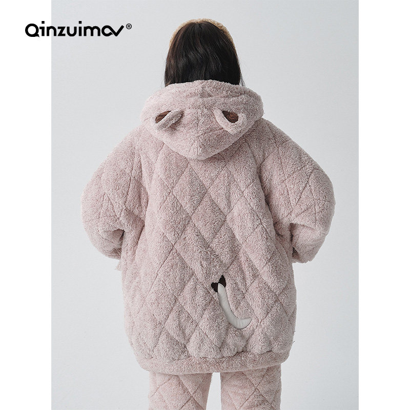 Pajamas Women's Winter Coral Suede Student Dorm Room Thickened Triple Clip Cotton Cute Flannel Sumpsuit Suits outside Home Suits Suit