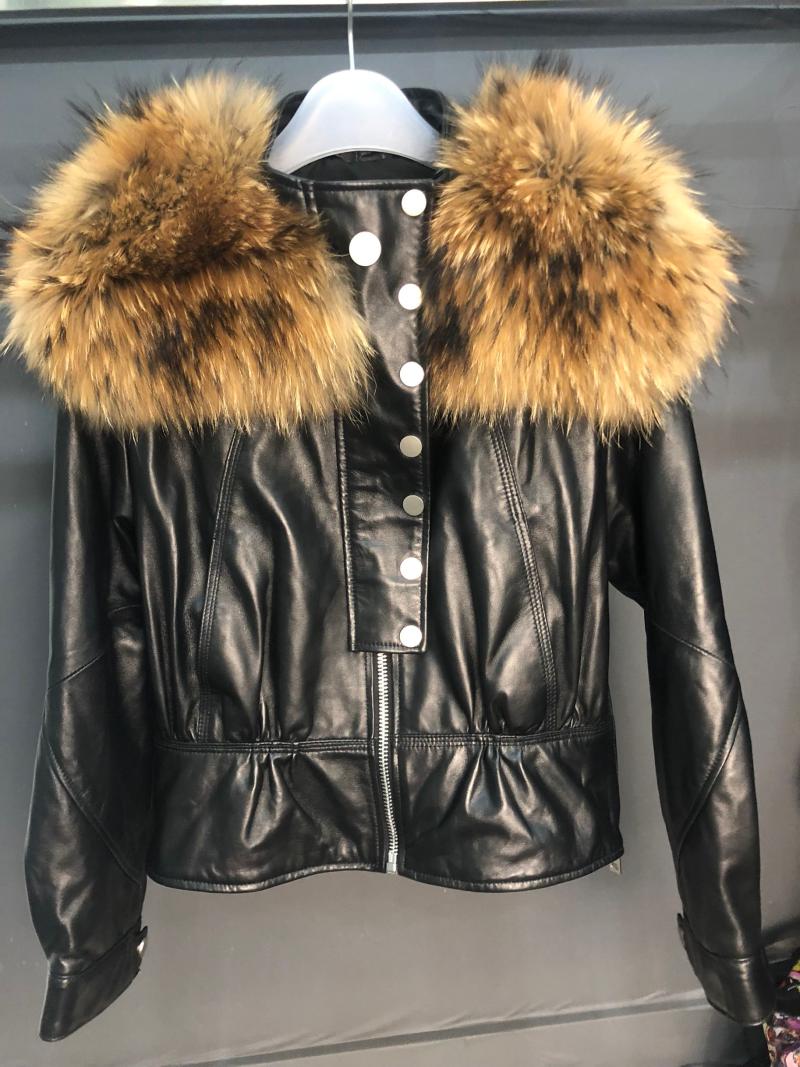 European Explosions Leather and Cotton Leather Women Widened Raccoon Wool Neck Short Coat Sheepskin Fashion Cotton Coat Jacket
