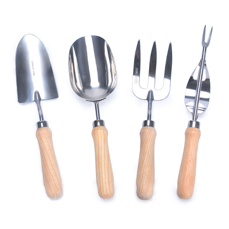 Stainless steel earth shovel Stainless steel three forks Stainless steel square shovel Stainless steel grass puller Stainless steel white wood handle shovel three-piece set