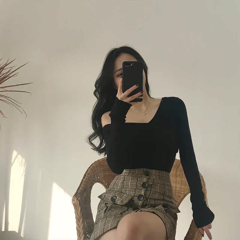 Large size one-shoulder top women's autumn 2020 new slim sloping shoulder suspenders scheming off-shoulder bottoming knitted sweater women
