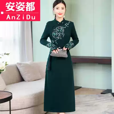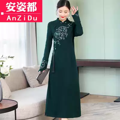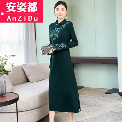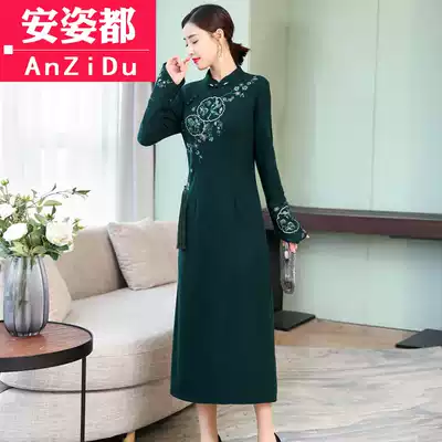 Tea clothing autumn and winter Zen women's new Chinese style improved cheongsam dress long sleeve medium and long skirt