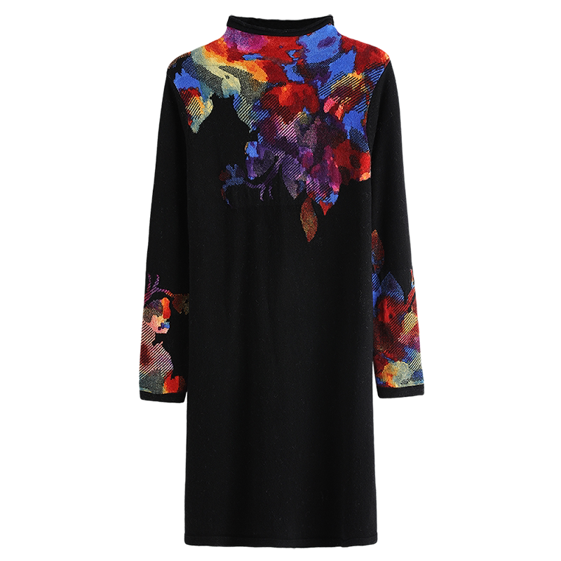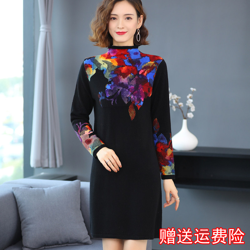 Lady's printed wool dress middle-aged women's sweater skirt thickened mid-length version large size cashmere sweater mother's dress