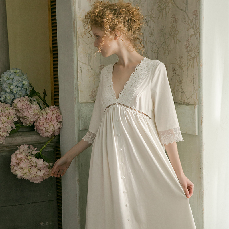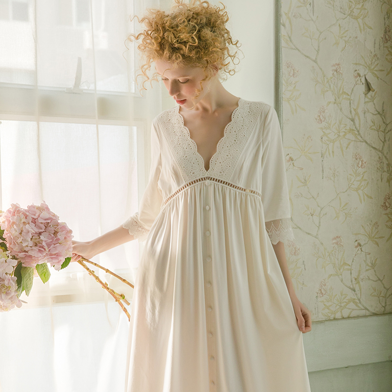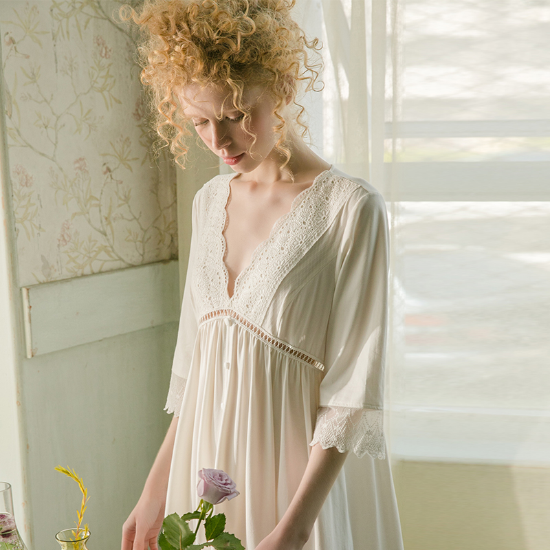 Dust-Hee Original Spring Autumn Sexy Lace V Collar Long Sleeve Sleeping Skirt Woman Retro Palace Court Long Version Bestie's home Sleeping Clothes