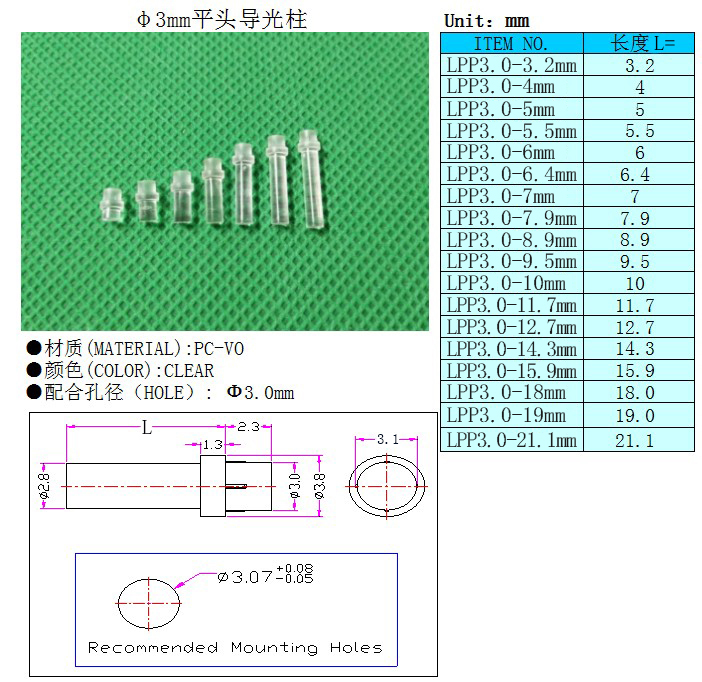 Aperture 3mmPC Transparent light guide column LED patch indicator lampshade with hat with card mark Flat head light guide column