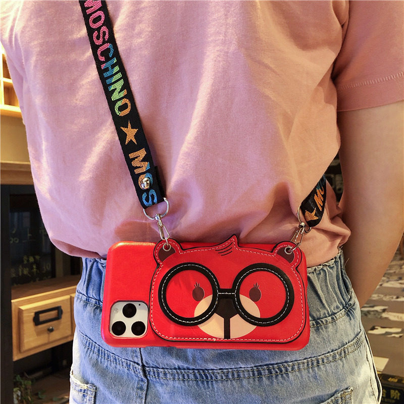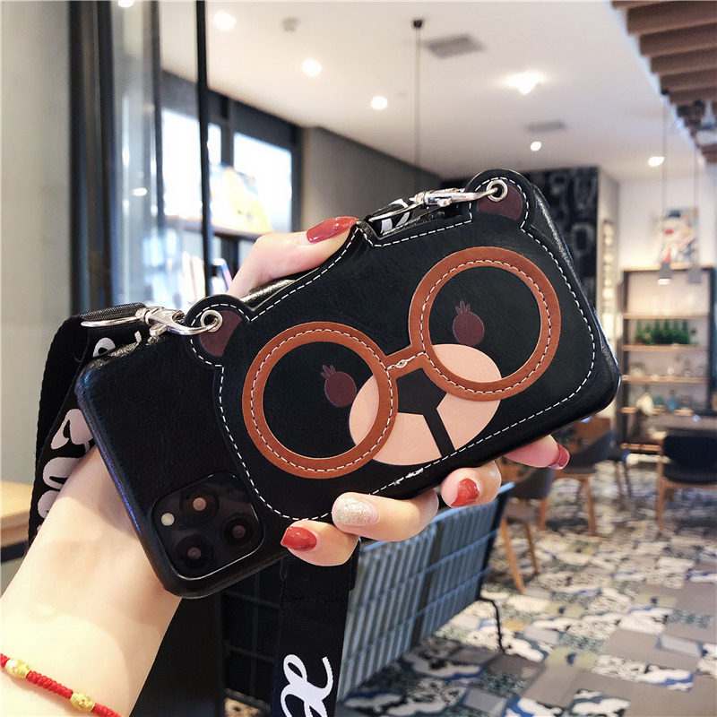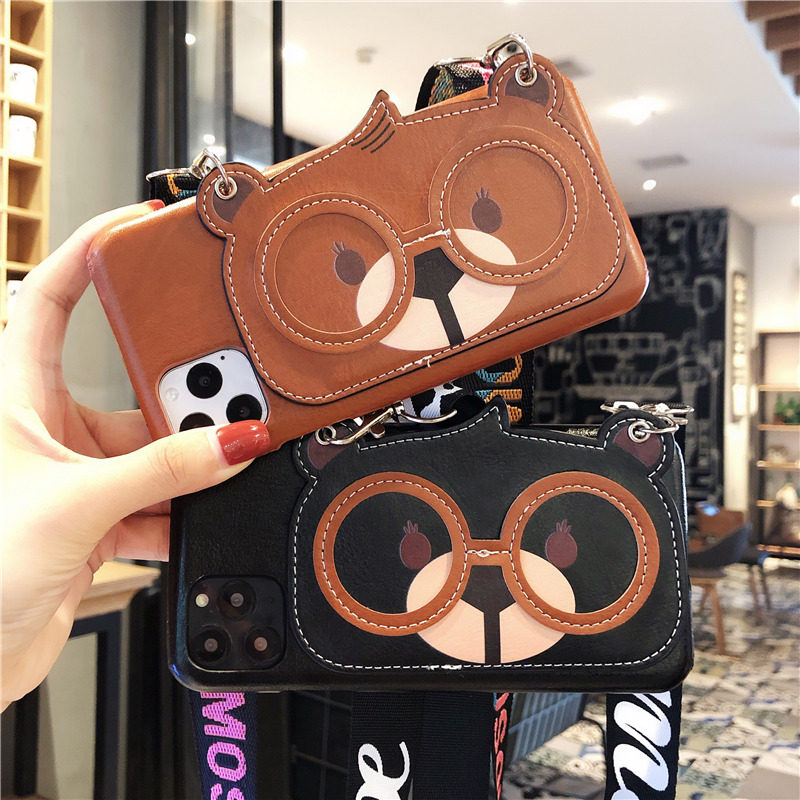 Luxury leather cartoon glasses bear iphone11 apple 11promax mobile phone case 8plus silicone iphoneX women's XR lanyard XsMax all-inclusive 7