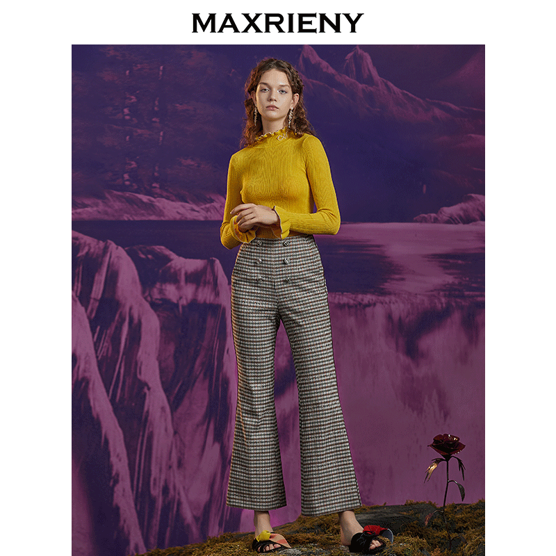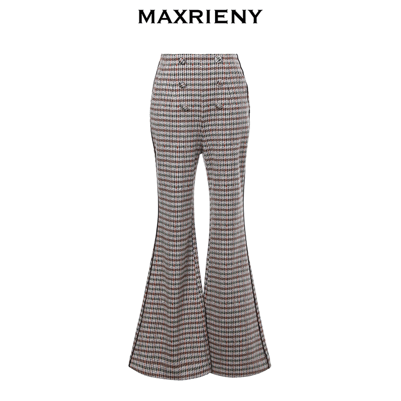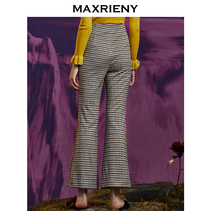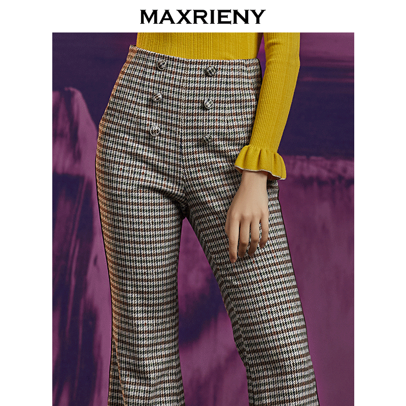 MAXRIENY winter new retro fashion Houndstooth slim trousers high waist micro flared pants women's wild tide