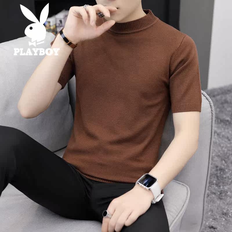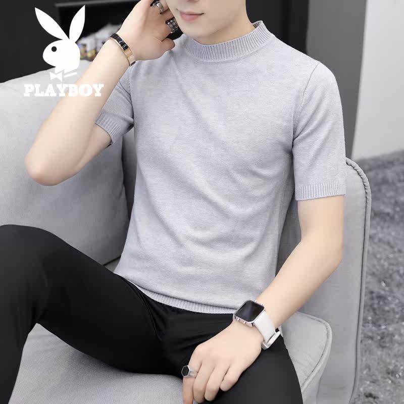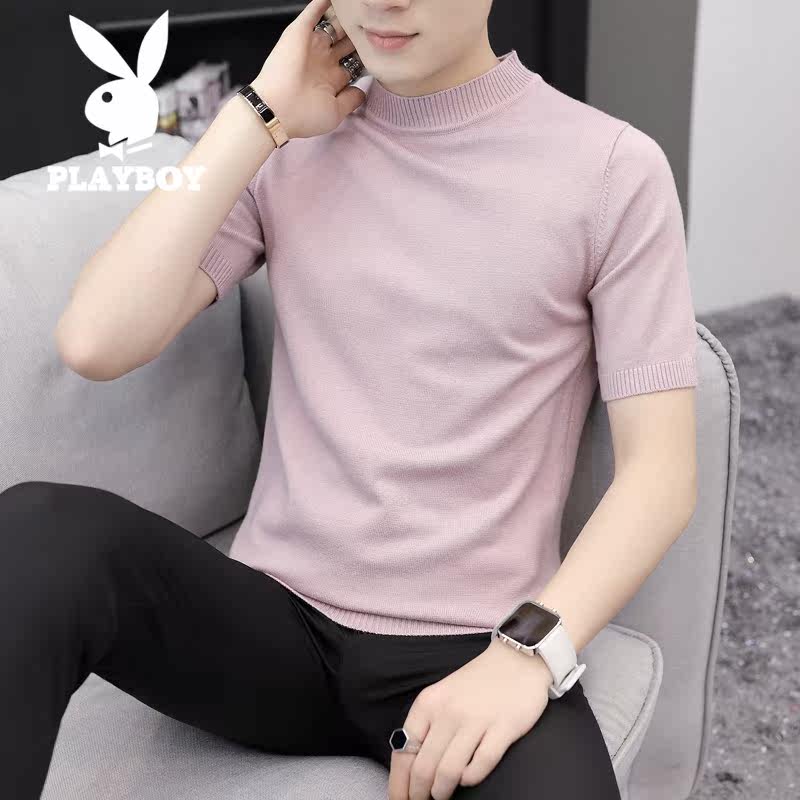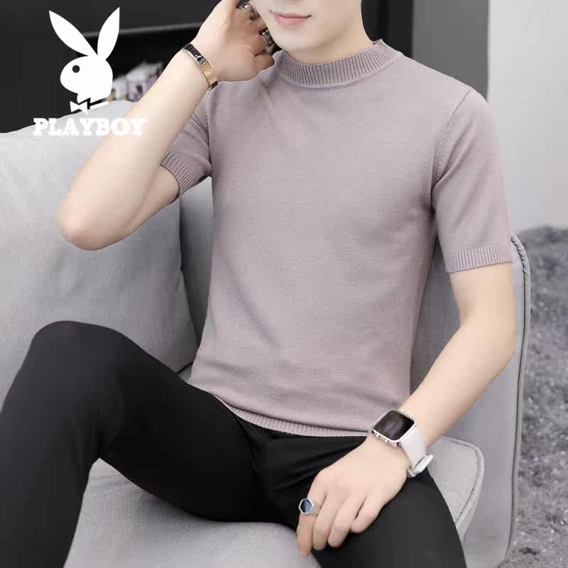 Playboy 2019 autumn new short sleeve sweater men's thin sweater trend half sleeve semi high collar sanitary clothes