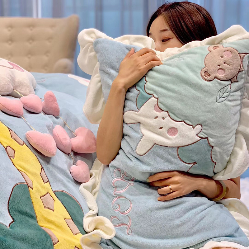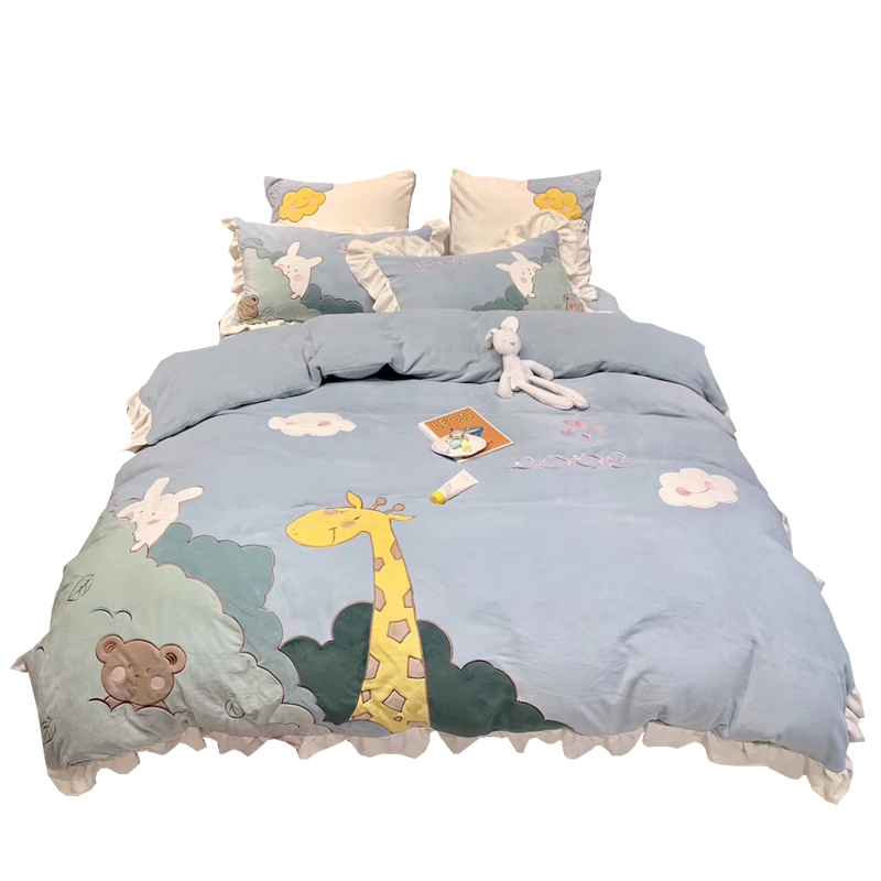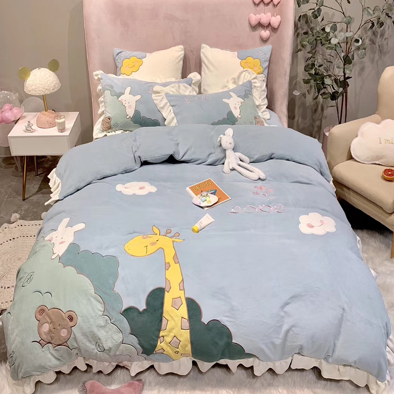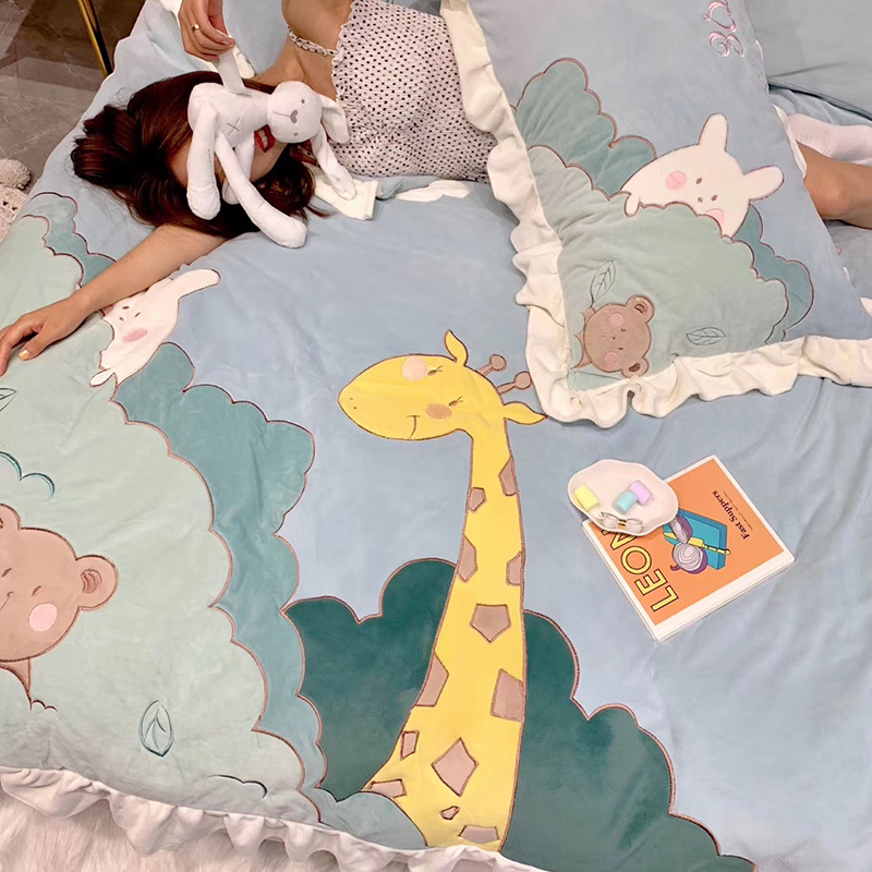 Autumn and winter warm coral velvet four-piece set milk velvet baby velvet cute cartoon giraffe plus velvet thick quilt cover