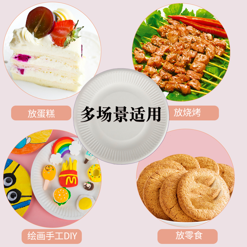 White cardboard 5-inch disc 50 white cardboard 6-inch disc 50 white cardboard 7-inch disc 50 white cardboard 8-inch disc 50 white cardboard 9-inch disc 50 cane pulp paper 6-round 50 plate sizes