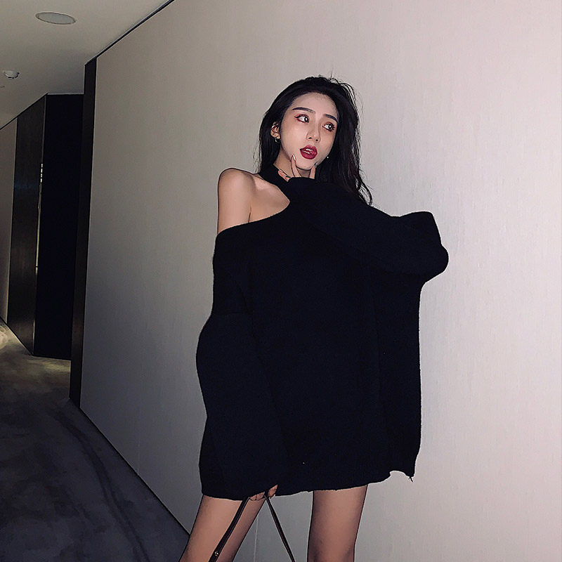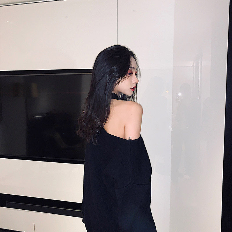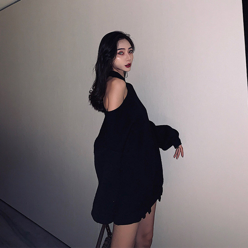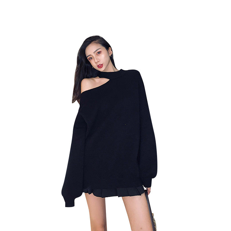 Sweater Women's loose outside wearing 2022 autumn and winter style Harbour wind careful machine leaking shoulder hanging neck loose sleeve head-knitted sweatshirt blouses-Taobao