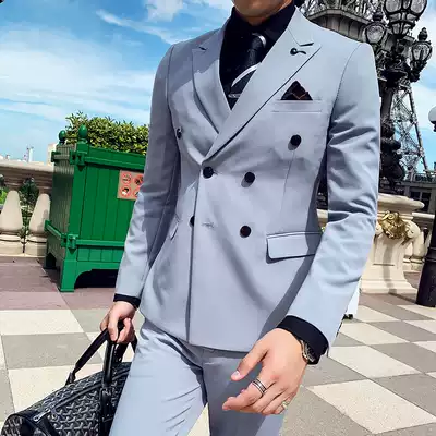 Autumn and winter slim Korean double-breasted small suit men's suit three-piece personality trend handsome hair stylist suit