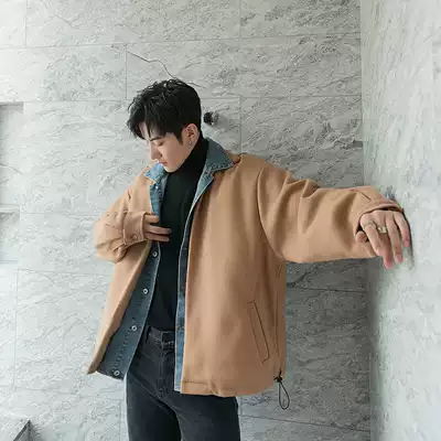 (Spot quick hair) denim splicing fake two woolen coat trend men loose autumn winter woolen jacket