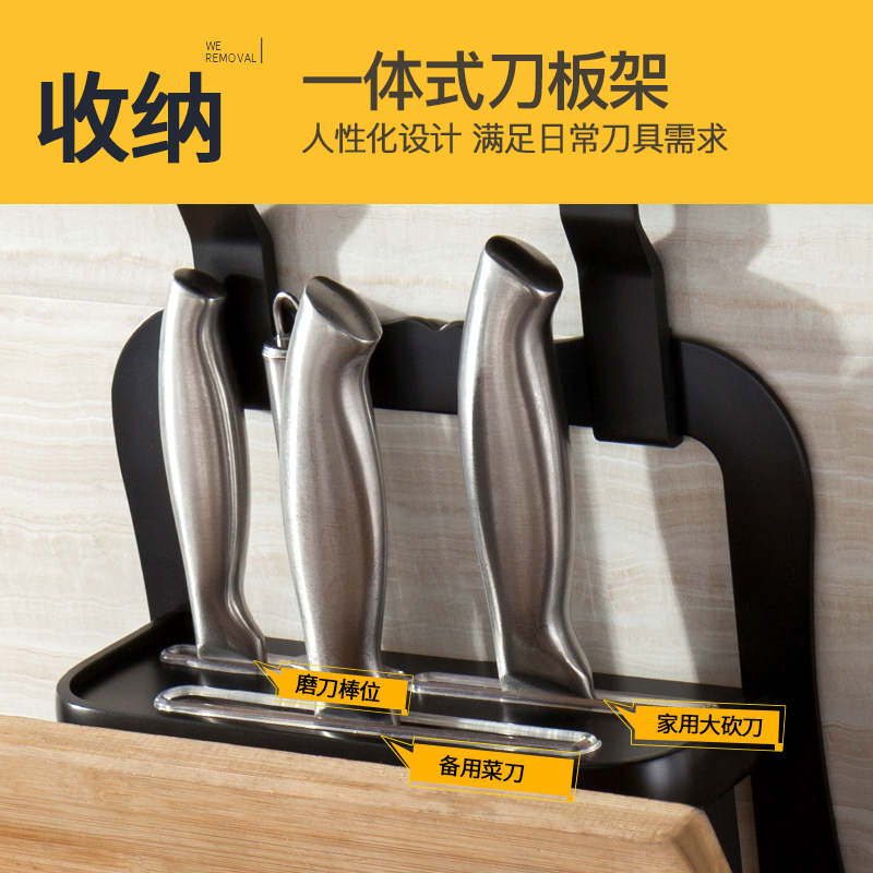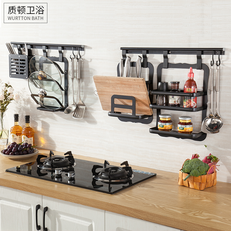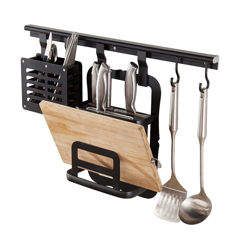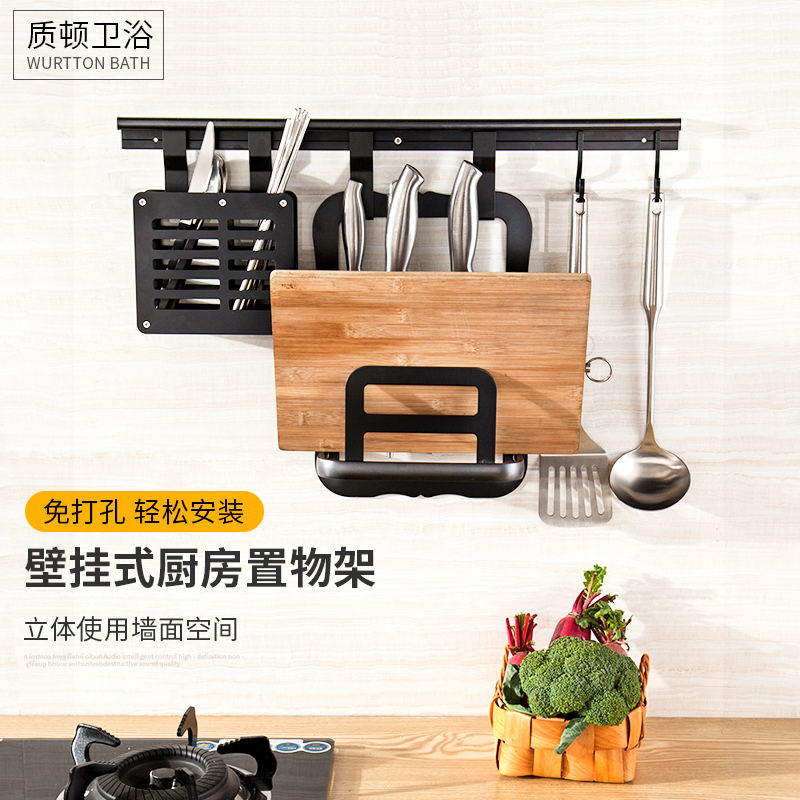 Kitchen rack wall-mounted hanging rod pendant knife rack seasoning chopsticks rack black wall free punching storage layer shelf