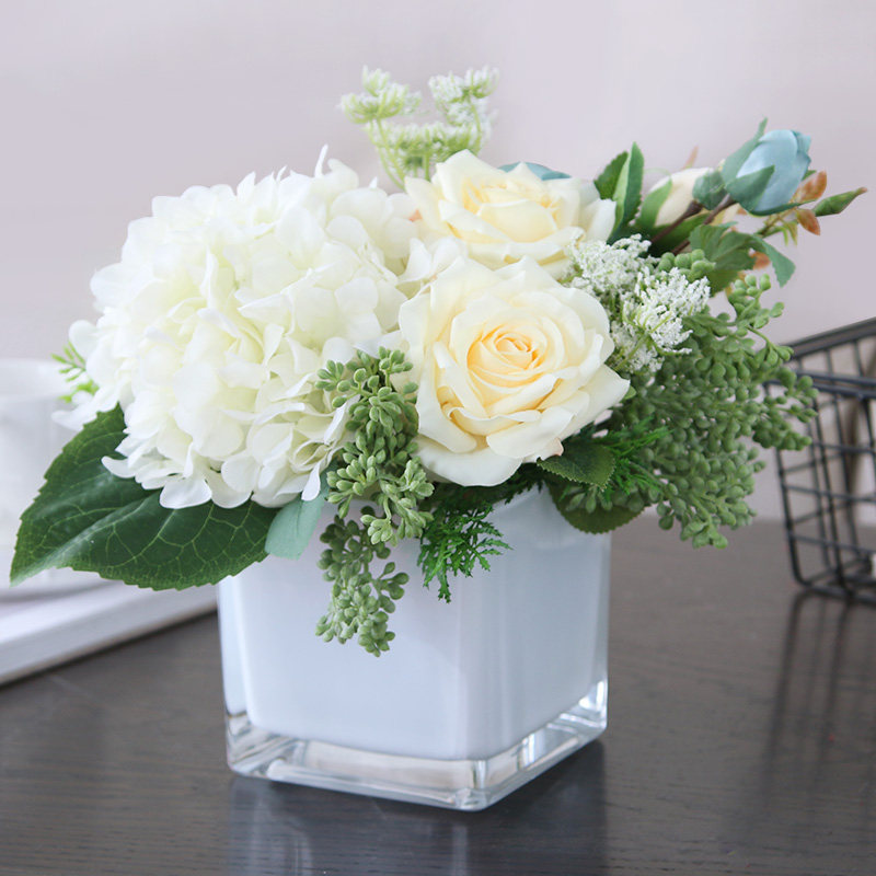 Simulation rose hydrangea set Glass bottle set combination Coffee table Dining table Bedroom floral arrangement Bouquet decoration flowers