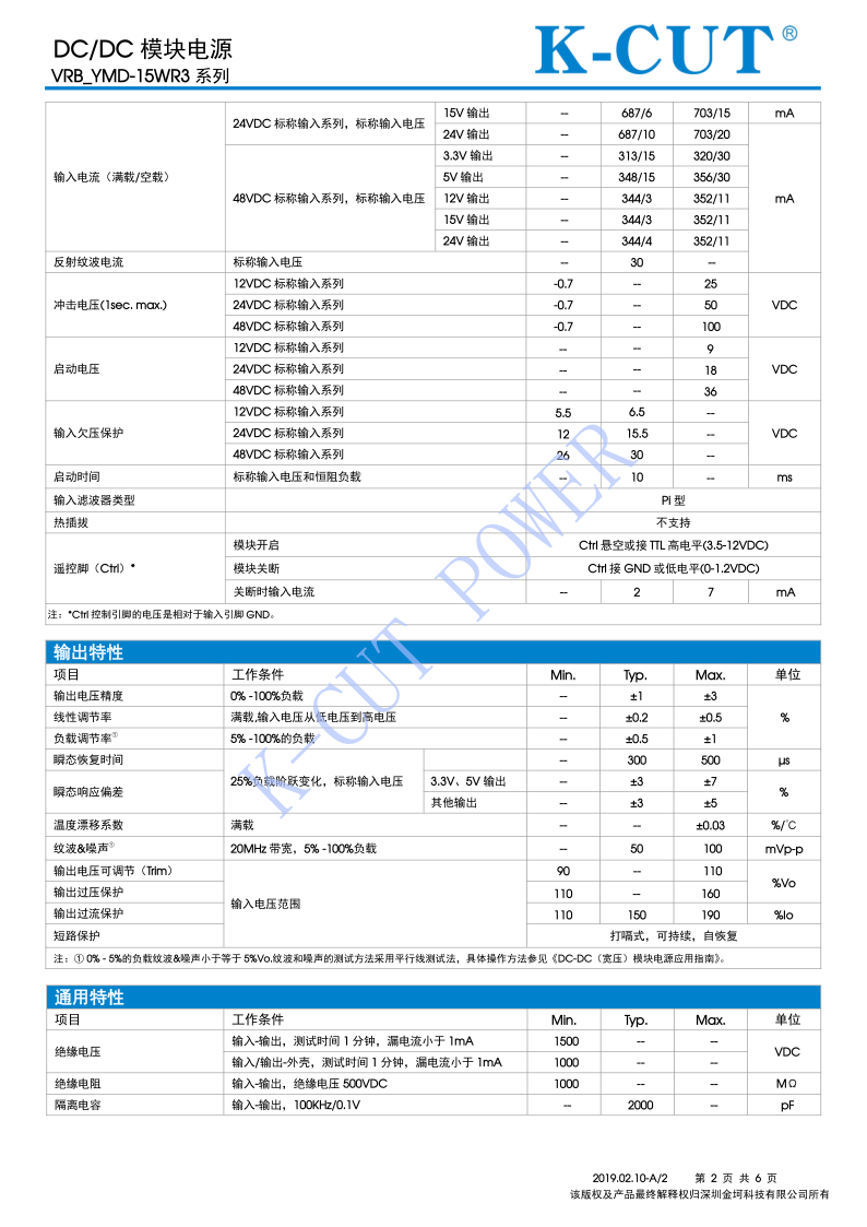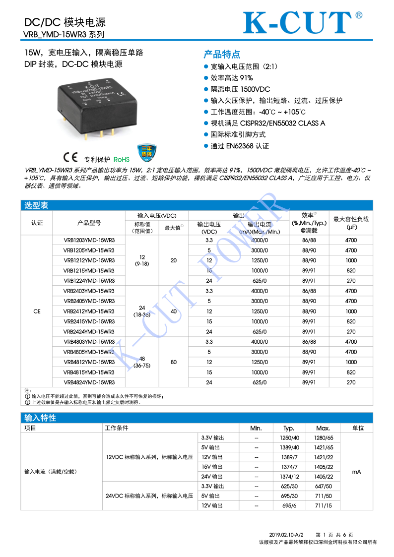 VRB4824YMD-15WR3 Input (36~75) 48V to 24V single output 15W DC-DC power module