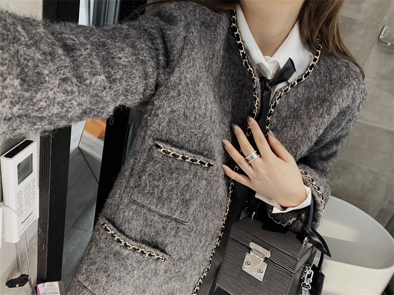 Celebrity Xiaoxiangfeng chain thickened woolen long coat women's 2022 autumn and winter new temperament gray A-line woolen coat