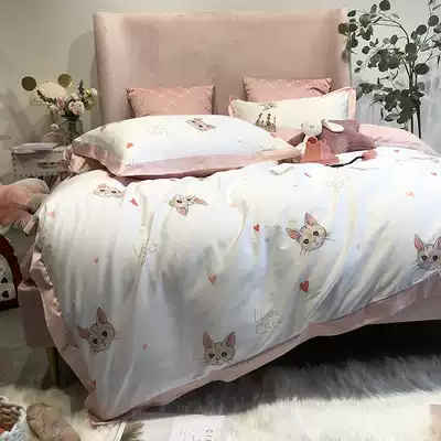 Cartoon cute cat quilt cover four-piece cotton pure cotton small fresh 60 plush cotton girl heart bedding
