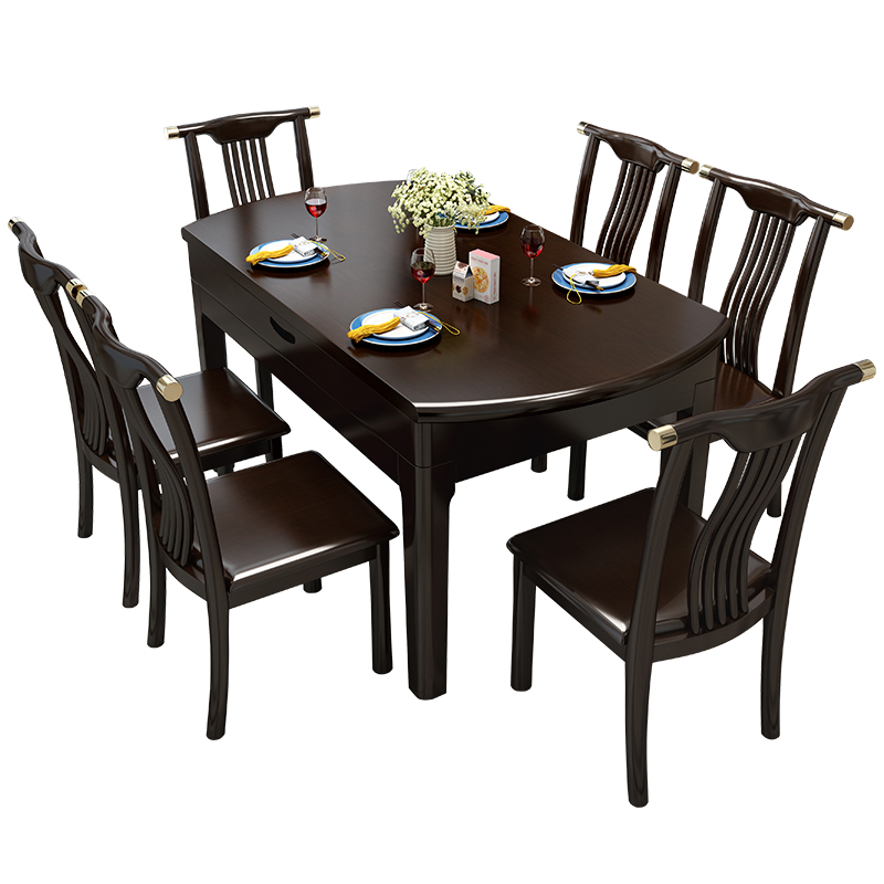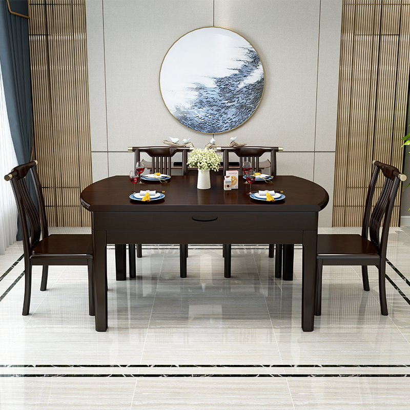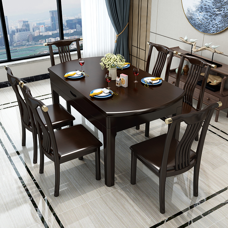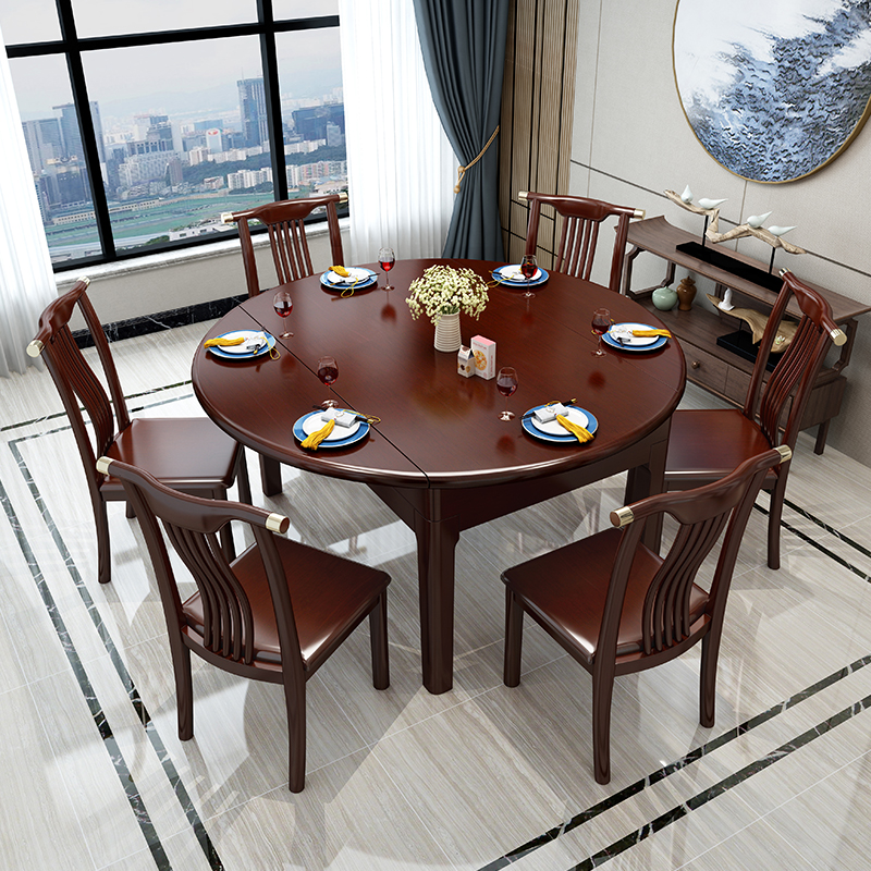 New Chinese round rectangular black sandalwood color telescopic folding and overlapping dual purpose Zen home full solid wood dining table and chairs combined