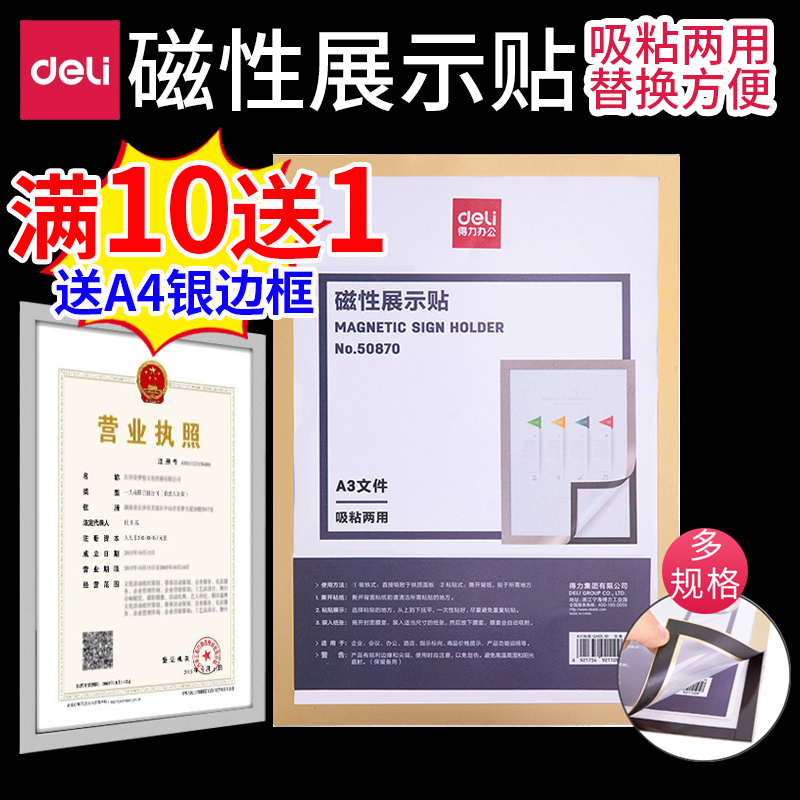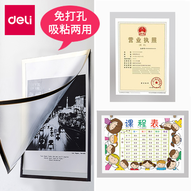 Deli magnetic display post a4 self-employed business license protective cover nail-free soft magnet Magnetic a3 oem adsorption wall document frame Transparent certificate framed poster frame Wooden honor photo frame